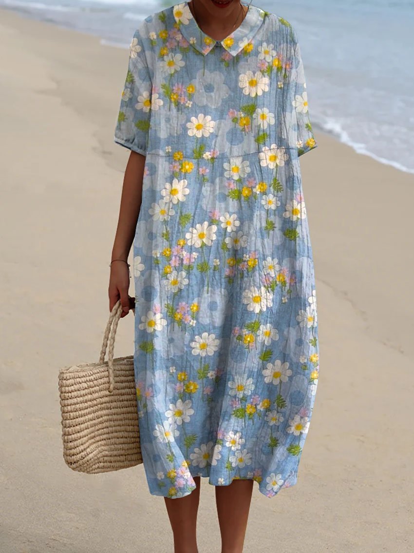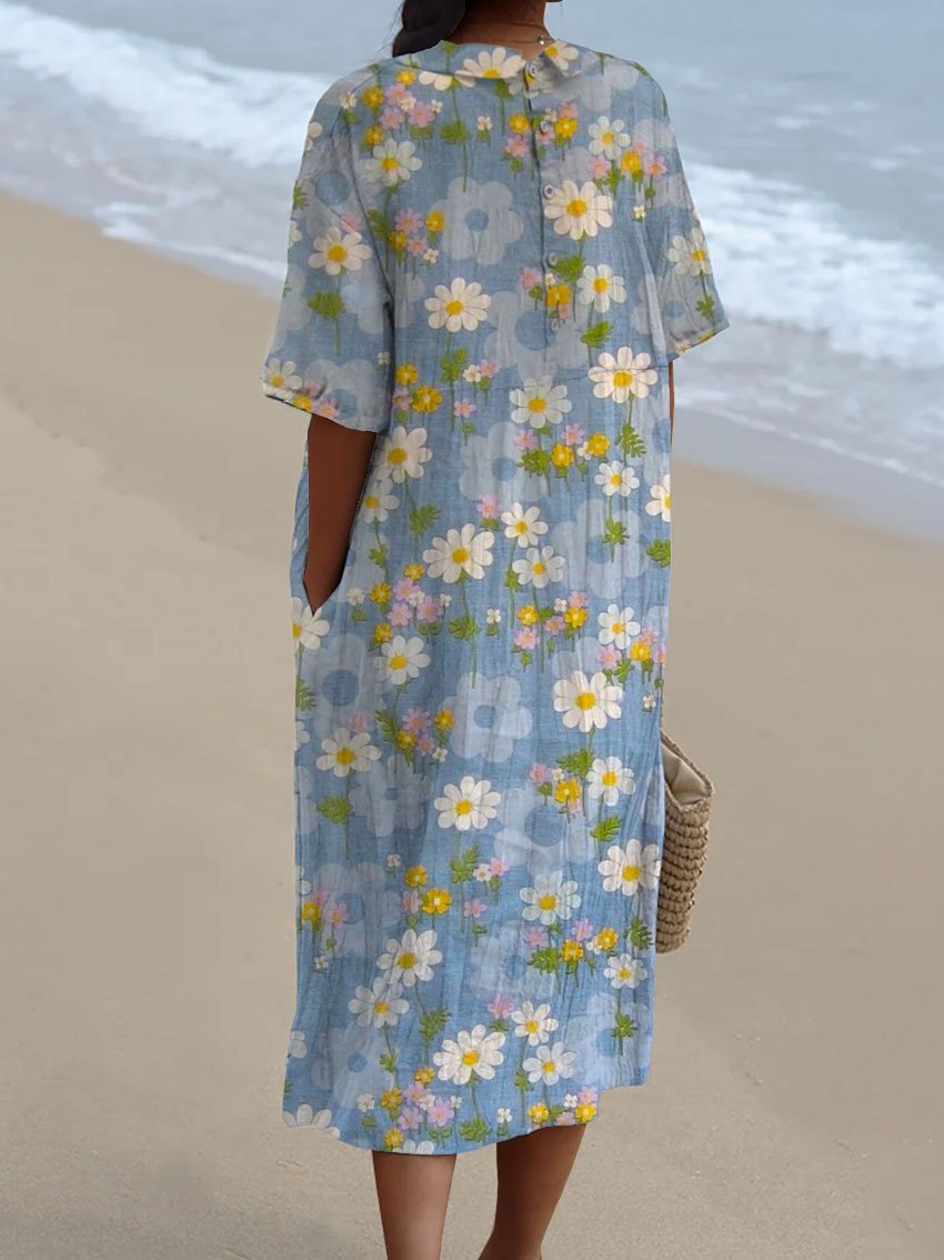Women's Vintage Floral Art Print Pocket Linen Dress(Convertible Dress With Front And Back Option)