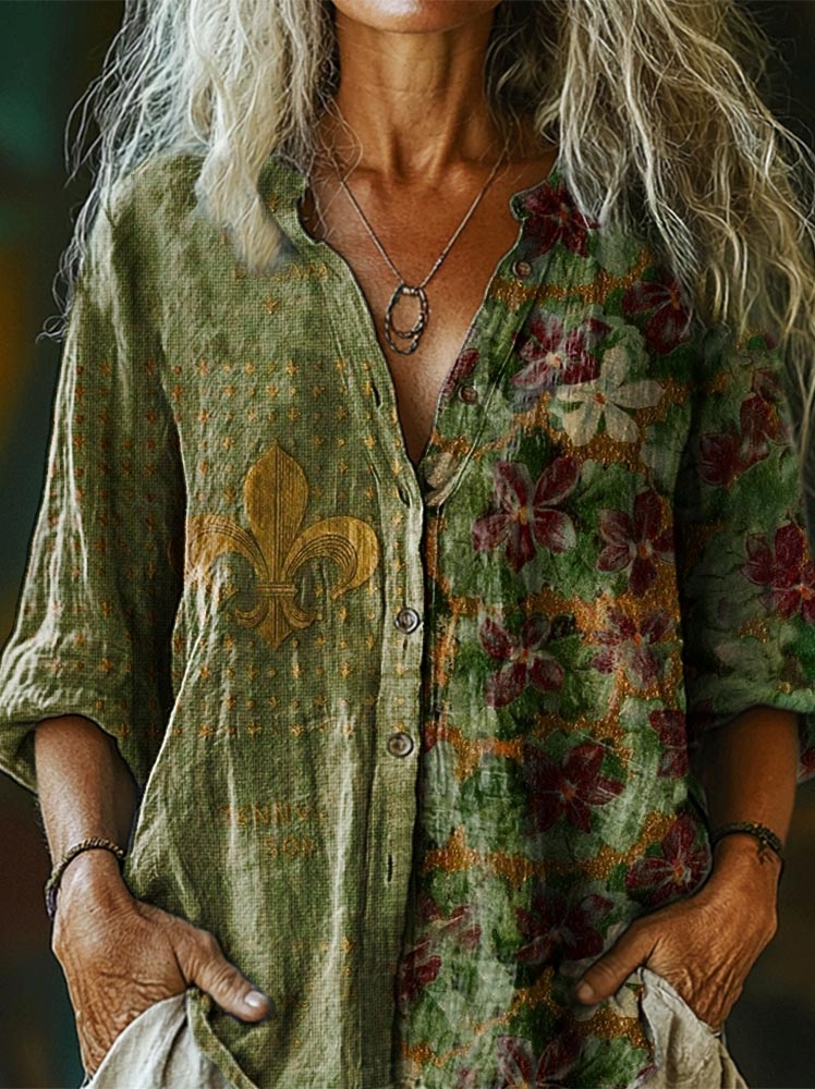 Women's Vintage Flower Art Print Casual Cotton Linen Shirt