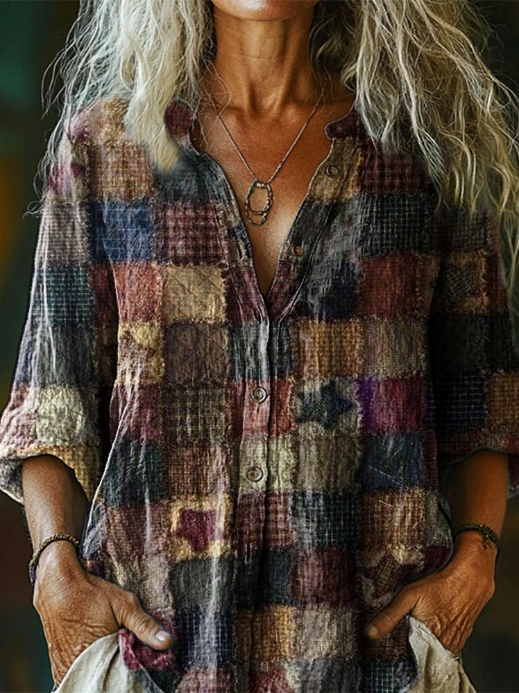 Women's Vintage Star Patchwork Art Print Casual Cotton Linen Shirt