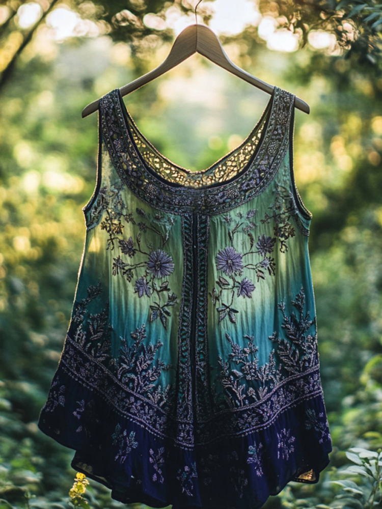 Vintage Purple Floral Embroidered Linen Tank Top
