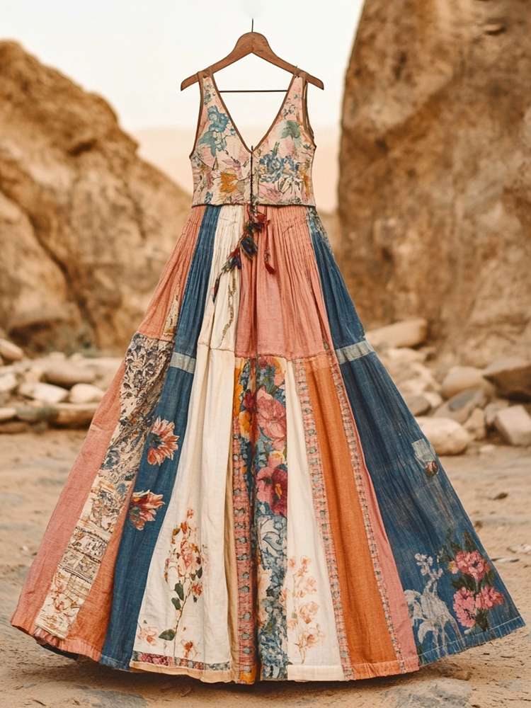 Women's Vintage Floral Patchwork Art Comfy Linen Dress