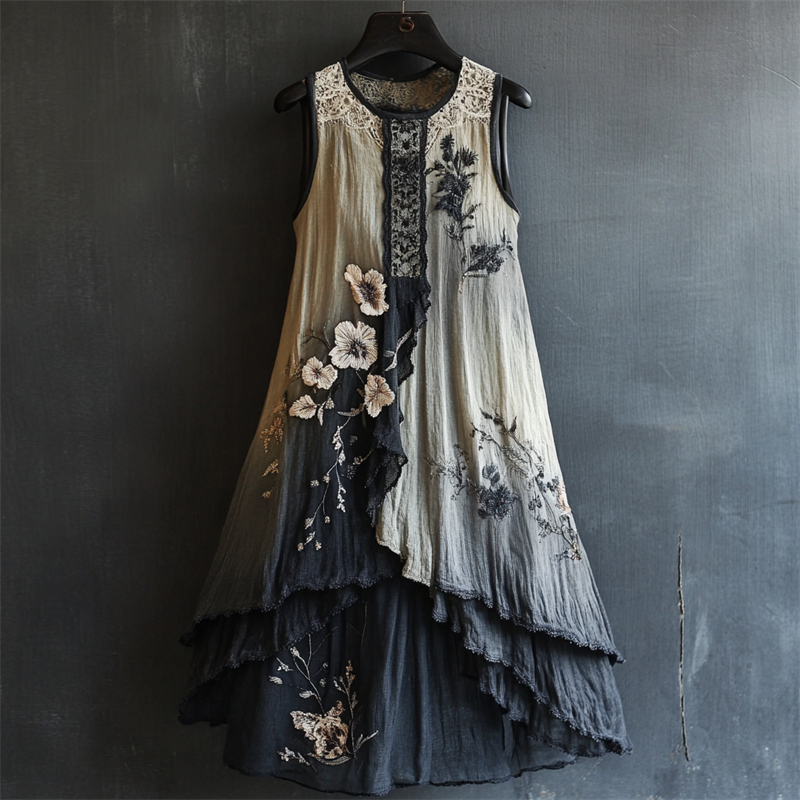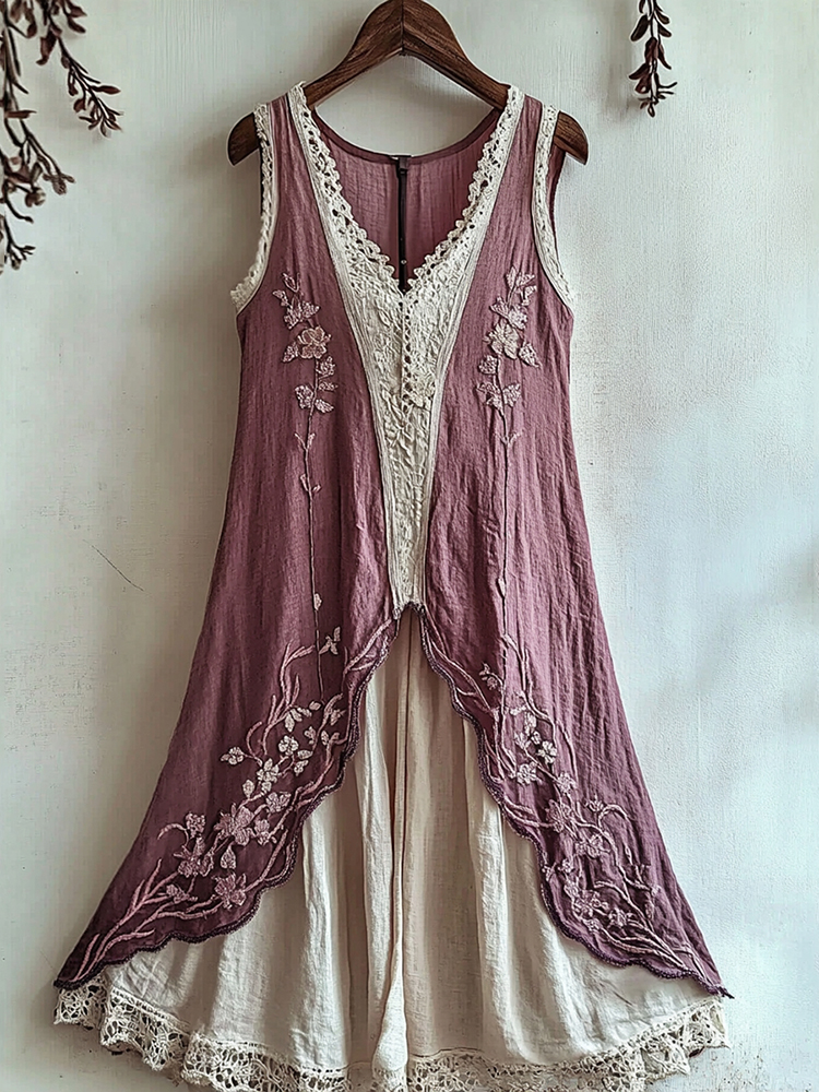 Vintage Gradient Embroidered Lace Patchwork Art Linen Dress