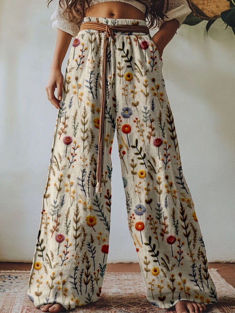 Vintage Boho Flowers Embroidered Linen Blend Casual Pants