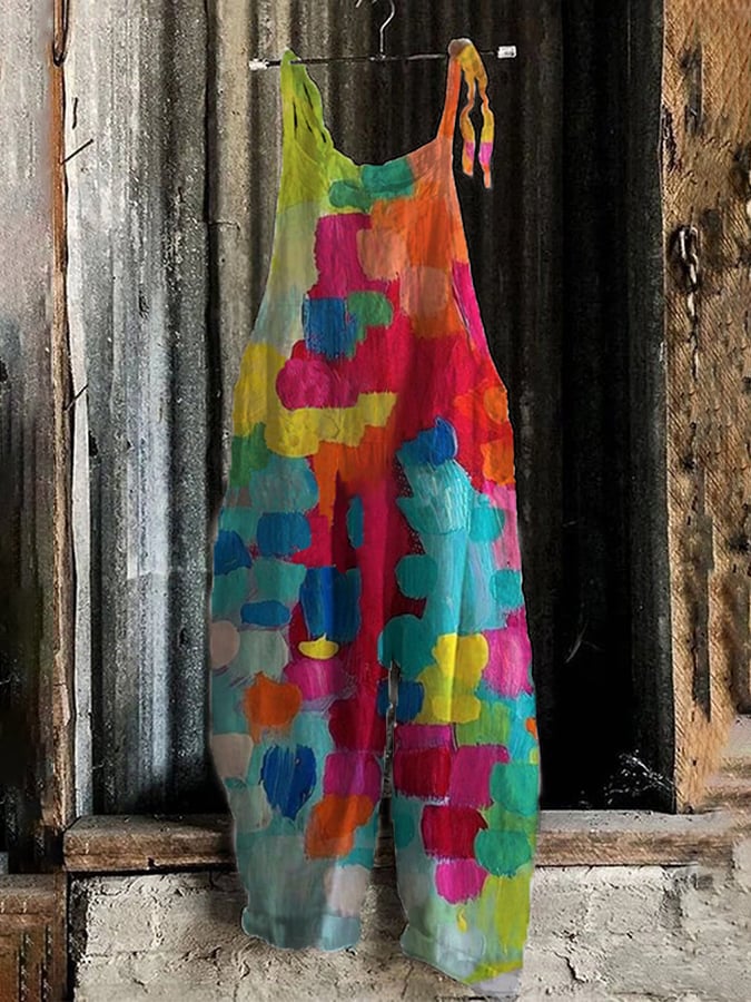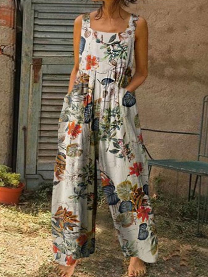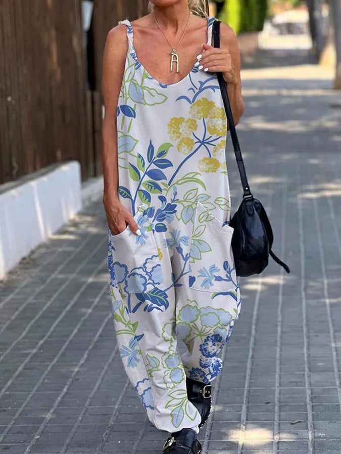 Women's Stylish Botanical Floral Design Casual Pocket Jumpsuit