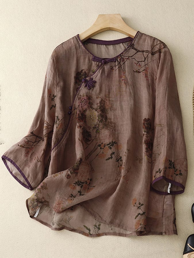Retro Vintage Ethnic Style Thin Print Frog Button 4/3 Sleeve Shirt