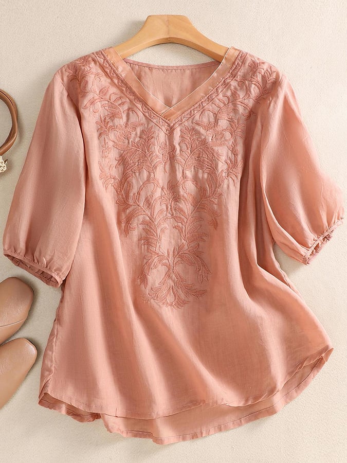 Mesh Embroidery V-Neck Loose Casual Shirt