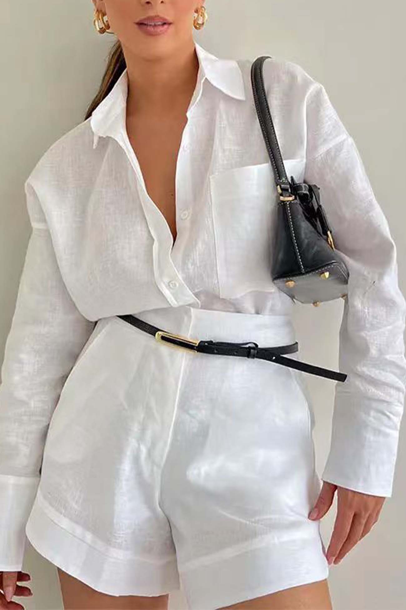 Cotton and Linen Solid Color Loose V-neck Lantern Sleeve Shorts Two-piece Set