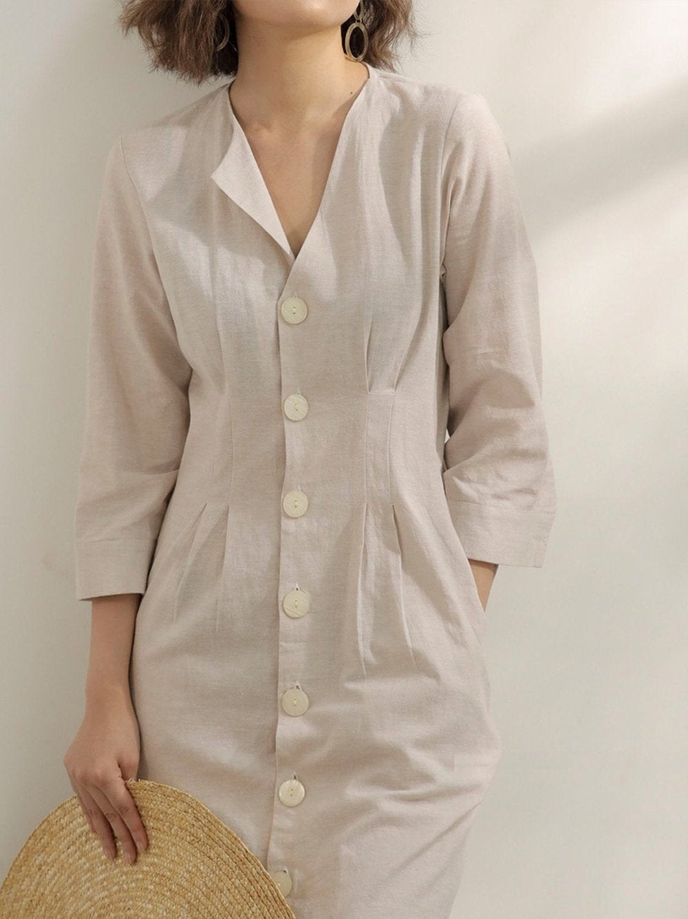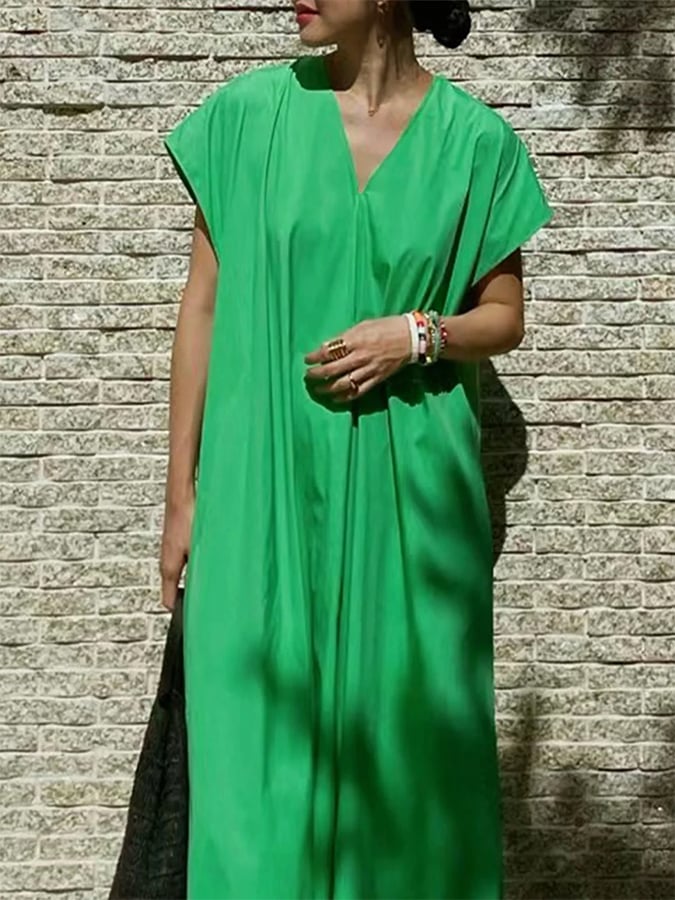 Women's Cotton And Linen V-Neck Solid Color Dress