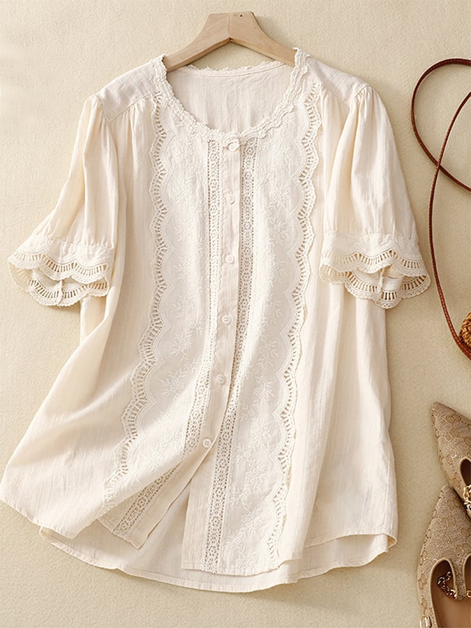 Solid Color Hollow Embroidery Lace Stitching Short-Sleeved Shirt