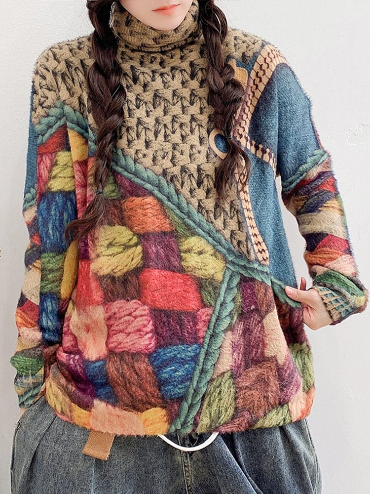 Coffee Cozy Patchwork Knitted Cotton Sweaters Turtleneck Long Sleeve