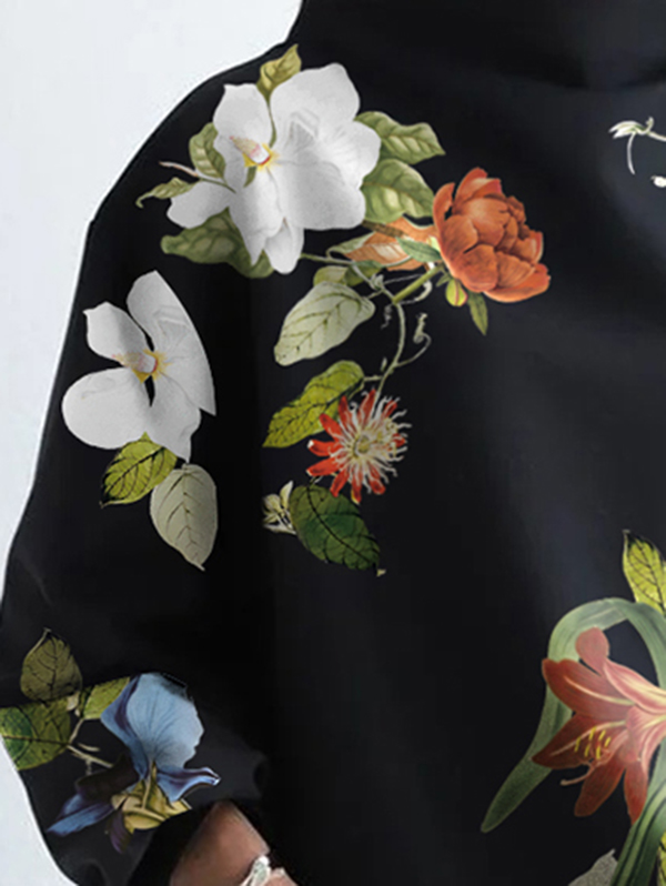 Long Sleeves Loose Asymmetric Floral Printed Split-Joint High Neck T-Shirts Tops
