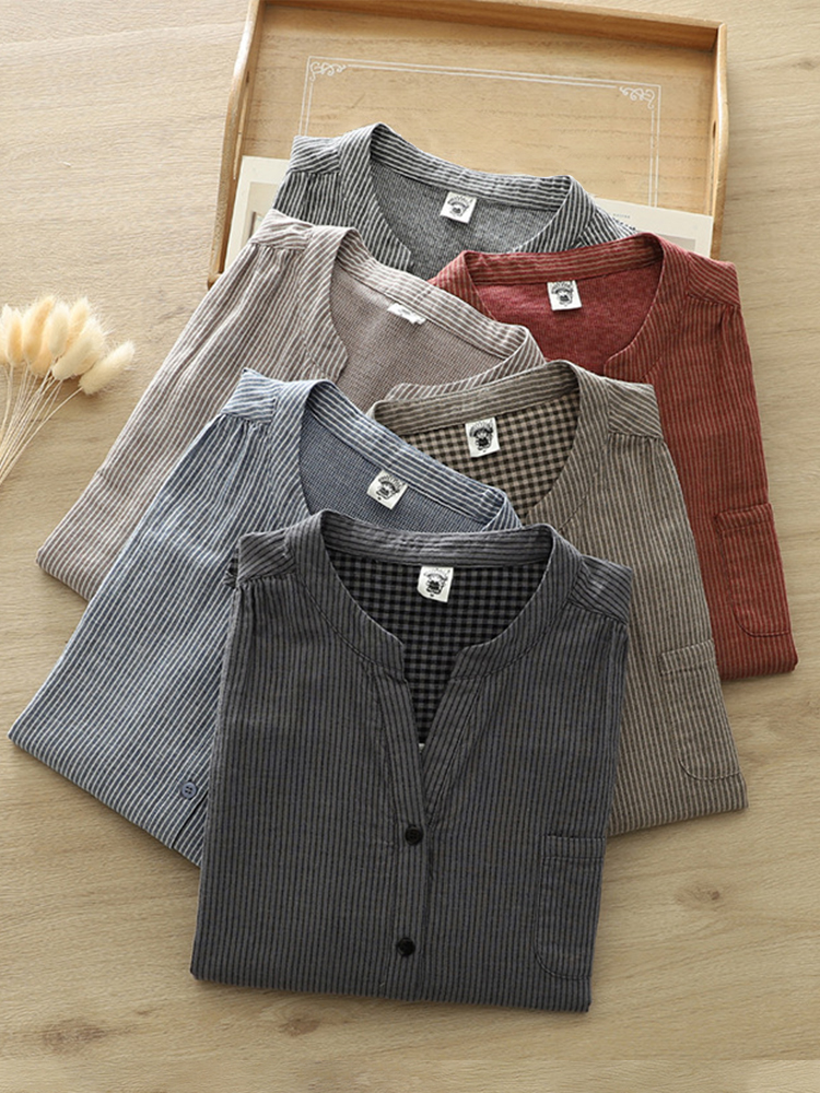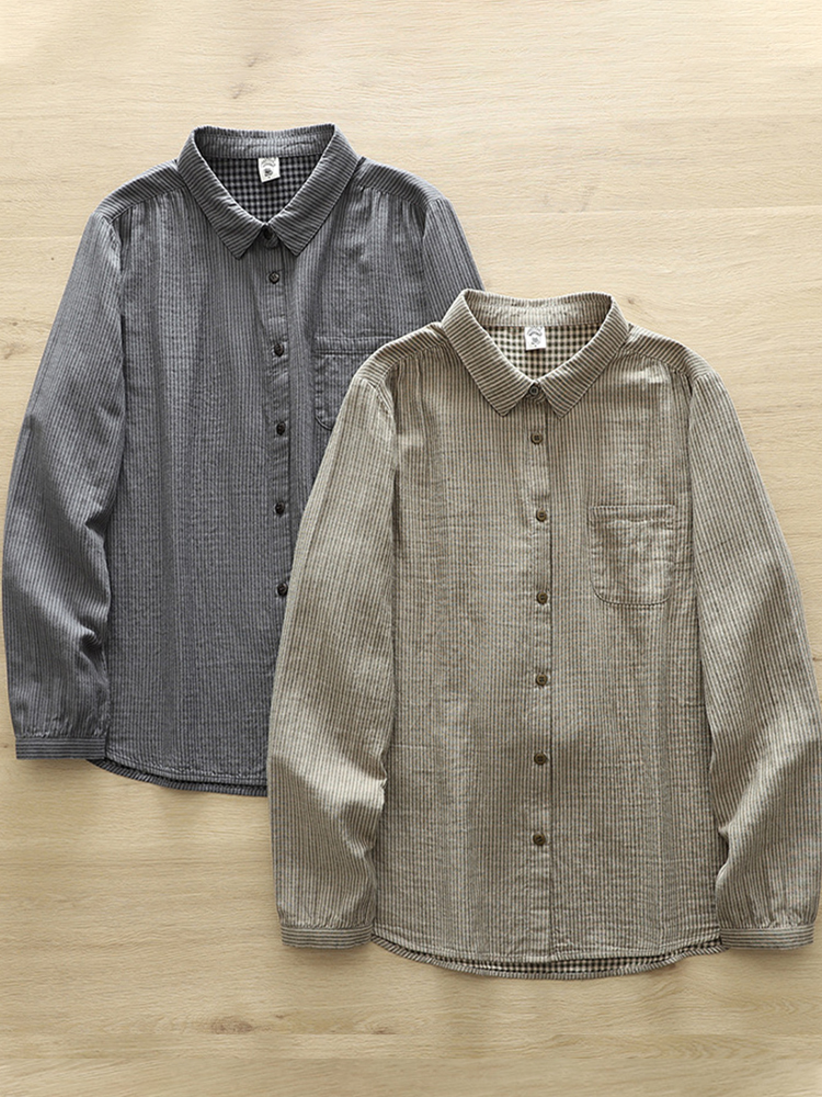 Women's Vintage Striped Linen Blend Long Sleeve Shirt