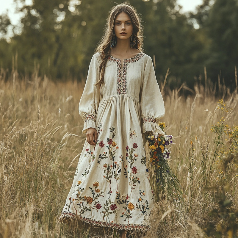 Vintage Floral Embroidery Women's Linen Long Dress