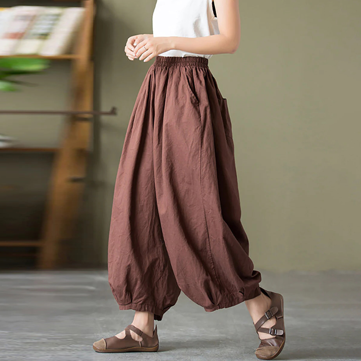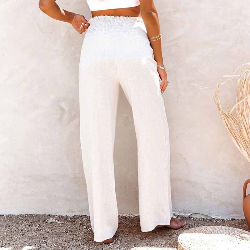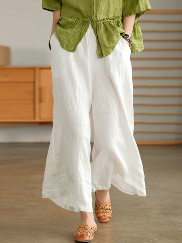 Vintage Plain Elastic Waist Button Down Loose Pant