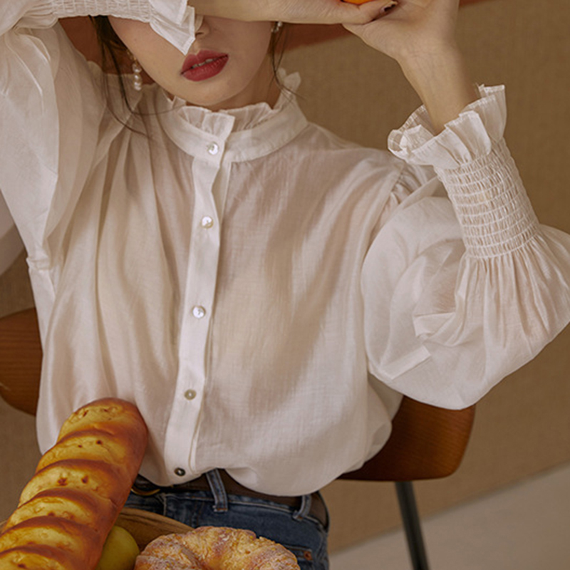 Vintage Stand Collar Lantern Sleeve Loose Blouse