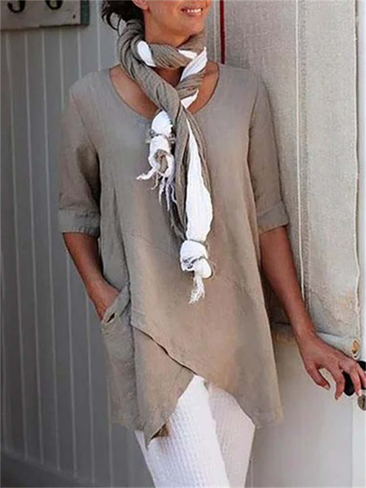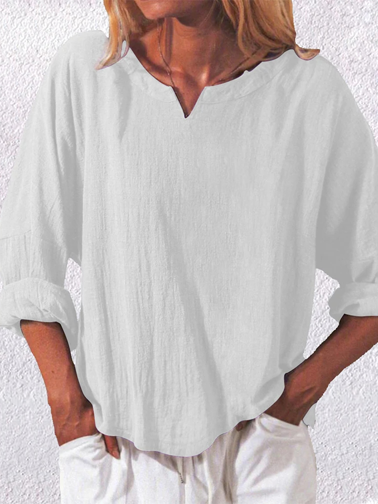 Casual Loose V-Neck Linen Long Sleeved Blouse