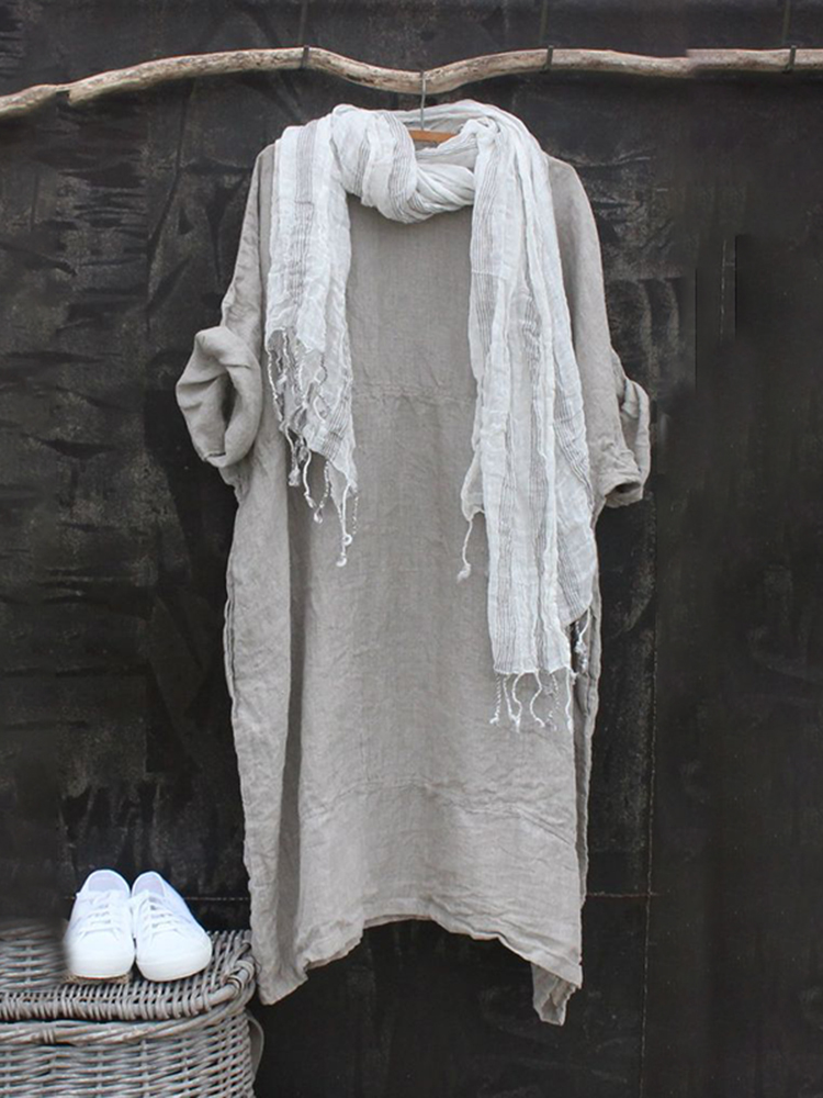 Solid Color Simple Loose Short Sleeve Linen Shirt Midi Dress