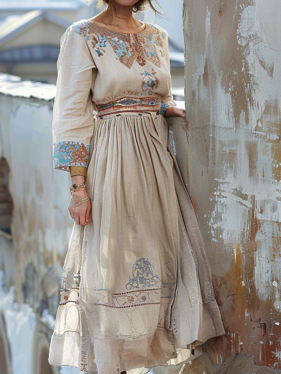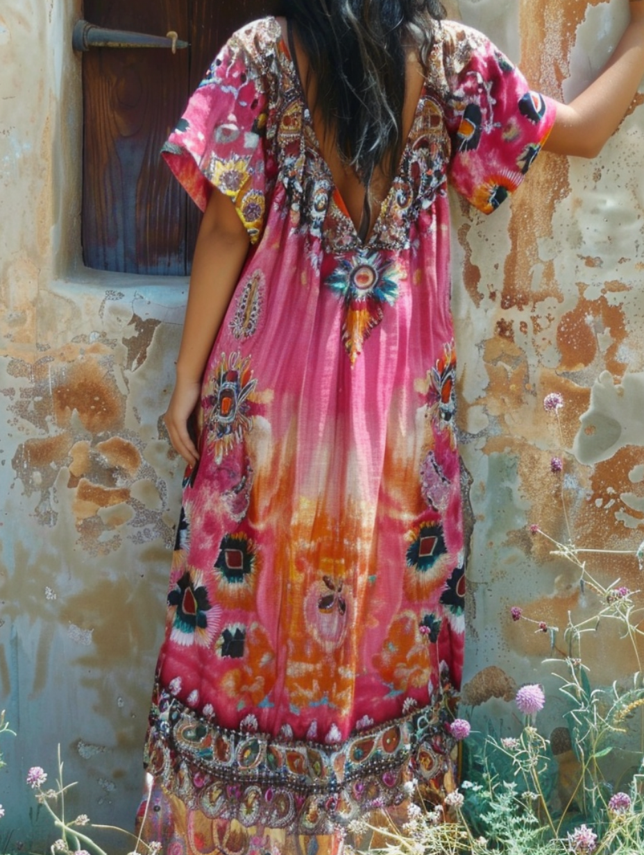 Linen Boho Stylish Printed Kaftan Maxi Dress