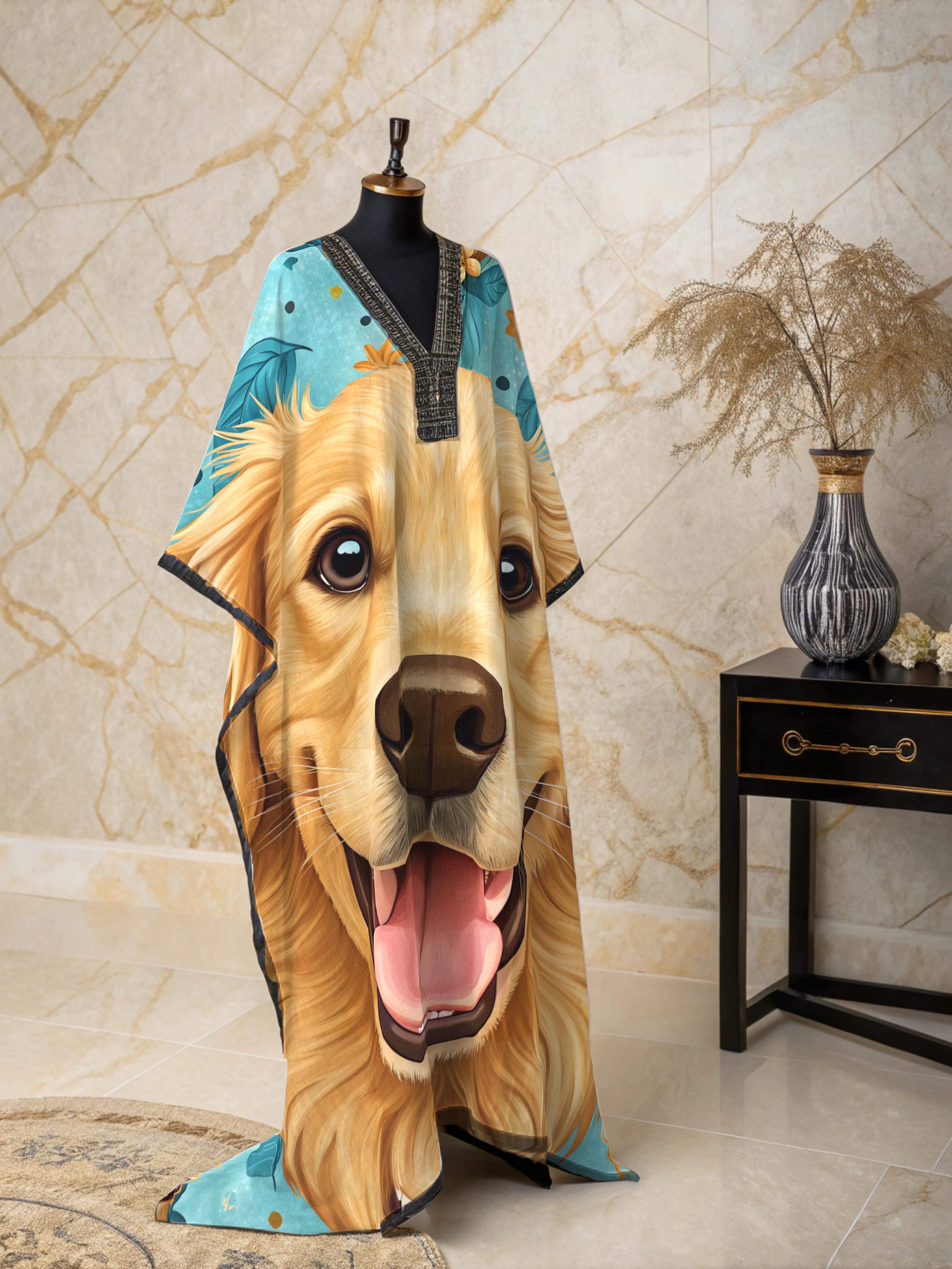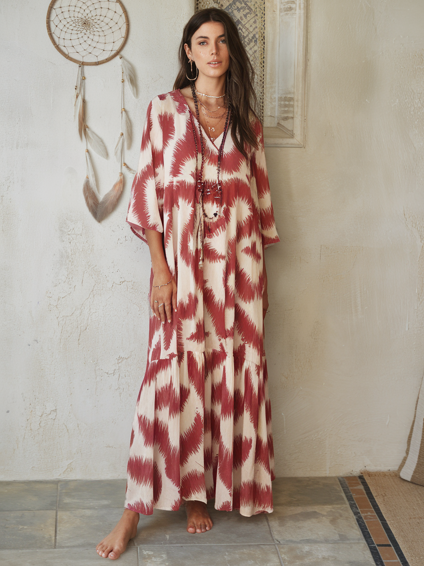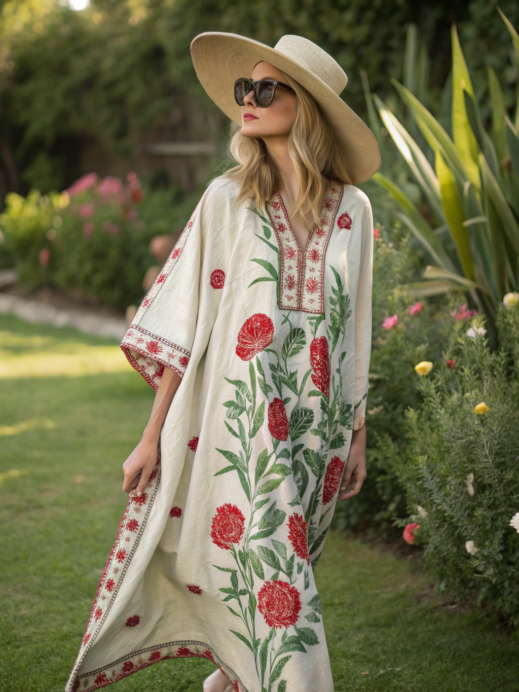 Contton & Linen Long Sleeve Butterfly Pattern Kaftan Maxi Dress