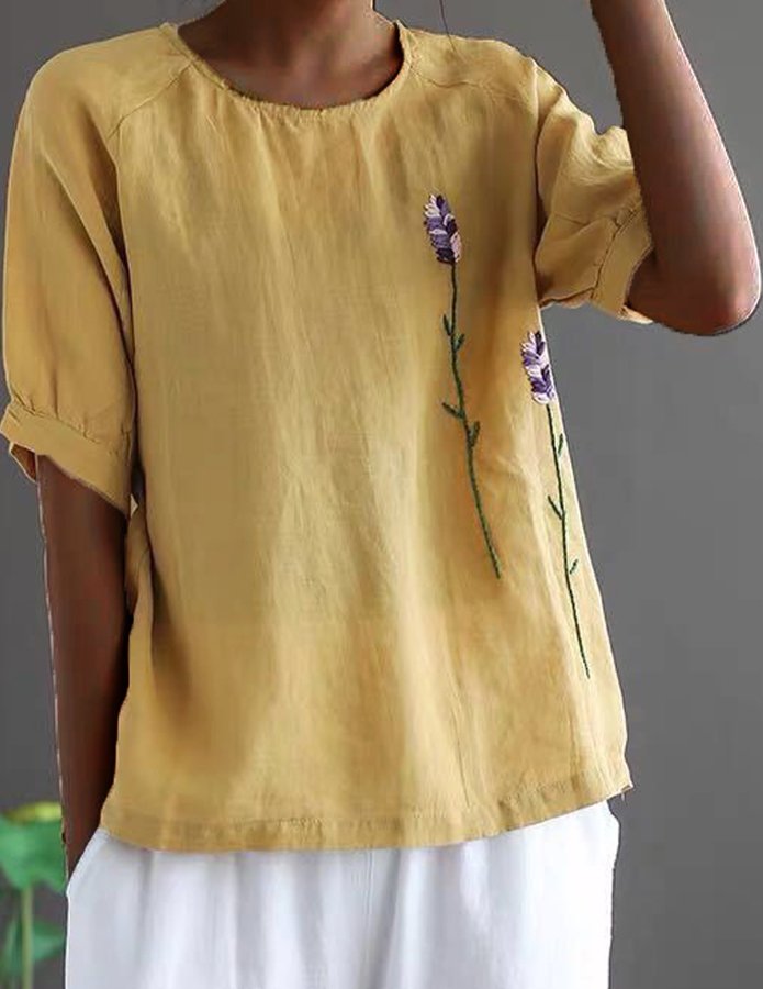 Women's Cotton Linen Embroidered Loose Casual T-Shirt