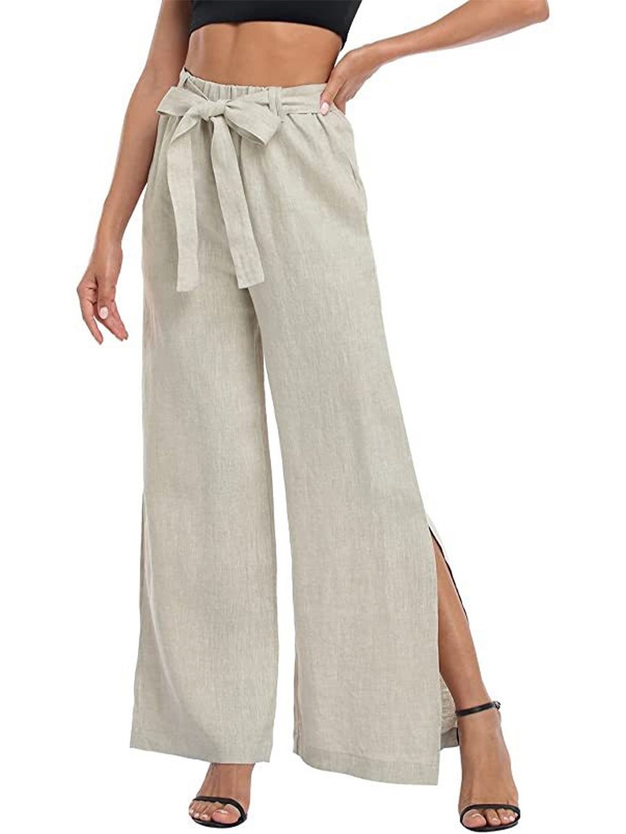 Women's Resort Style Solid Color Bow Knot Split Cotton Linen Wide Leg Pants