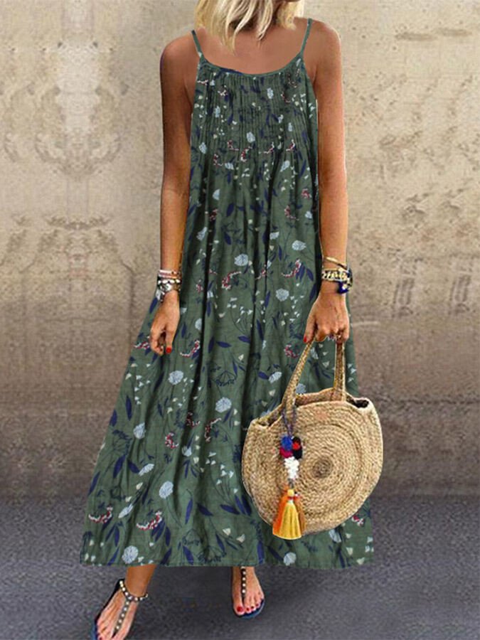 Women's Cotton Linen Print Slip Dress Mid Length Dress