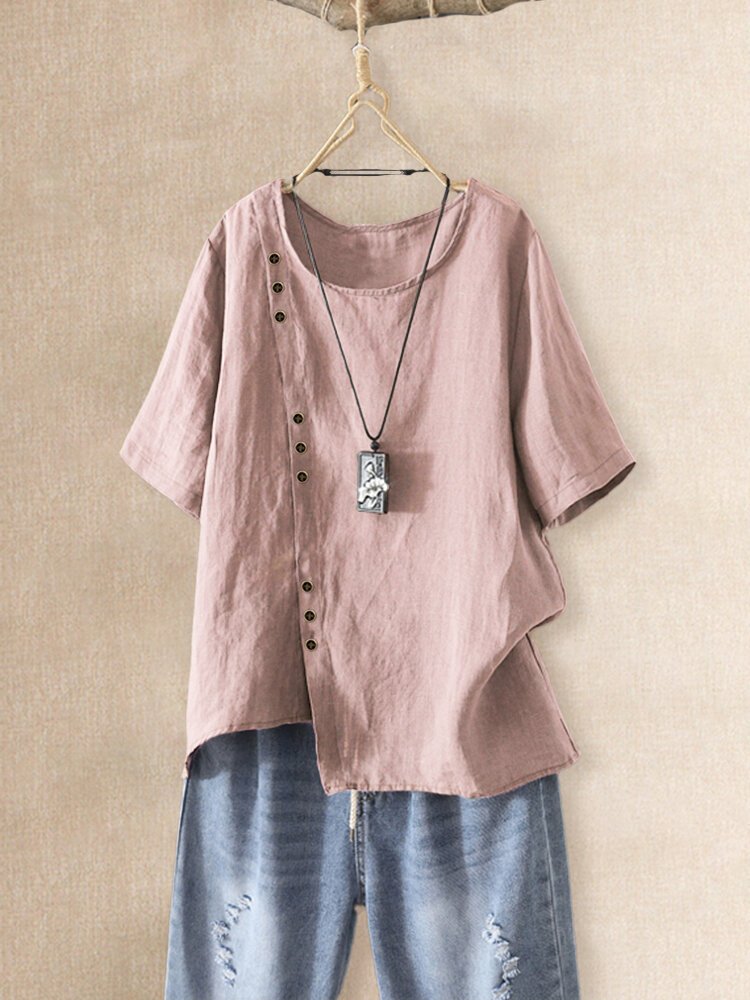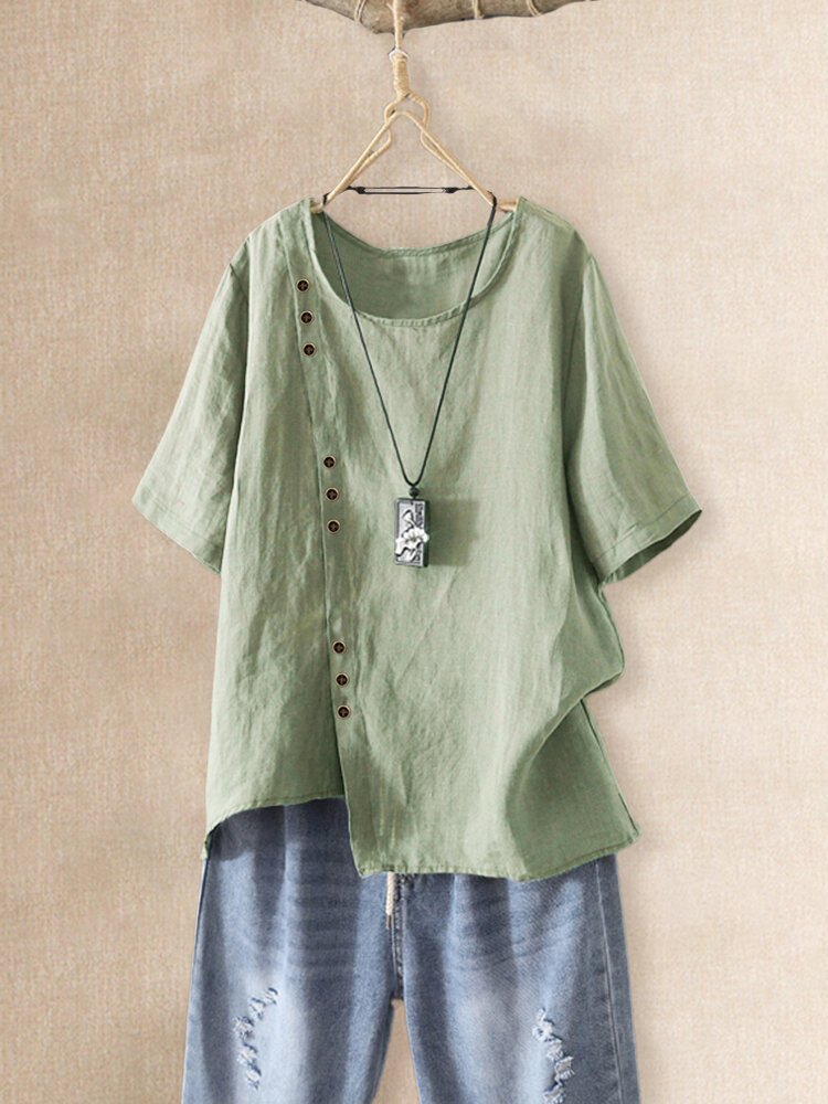 Women's Vintage Solid Color Irregular Hem Button Cotton Linen Shirt