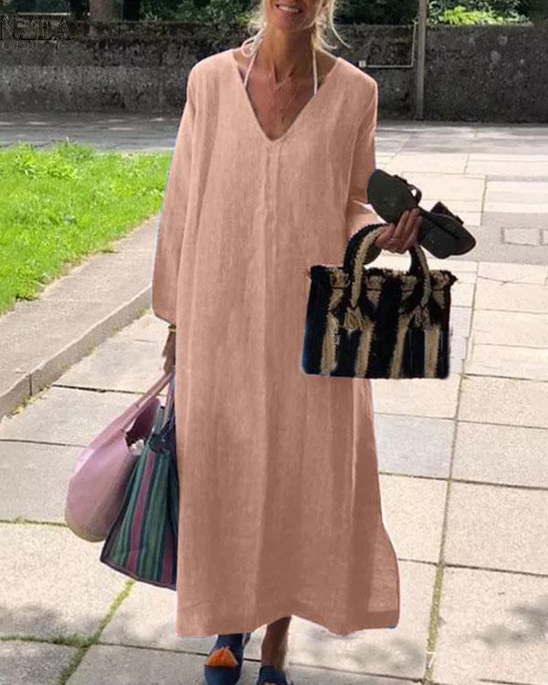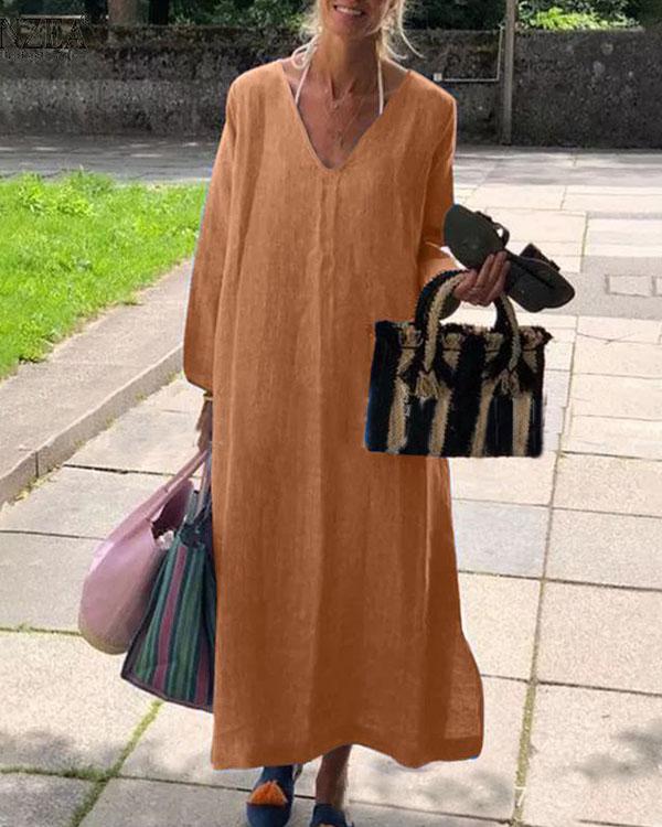 Casual Vintage Pure Color V Neck Linen Cotton Dress