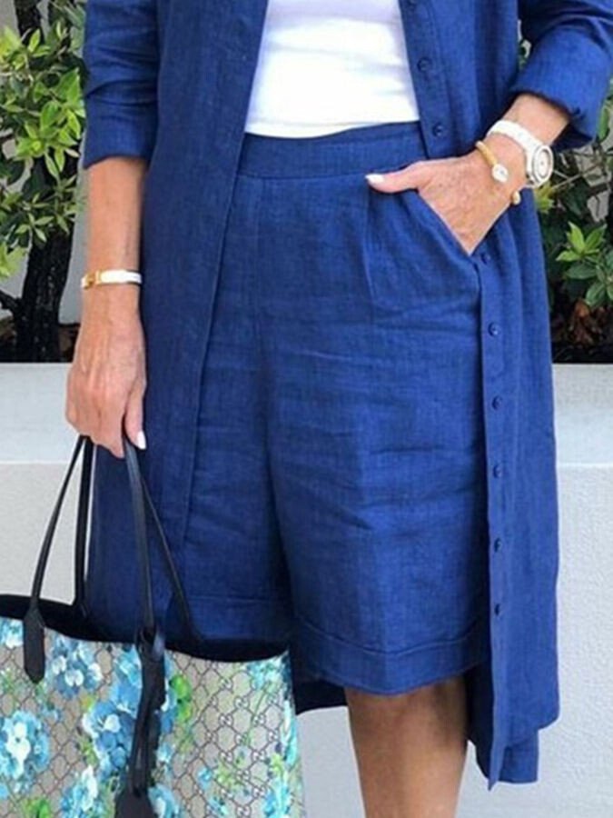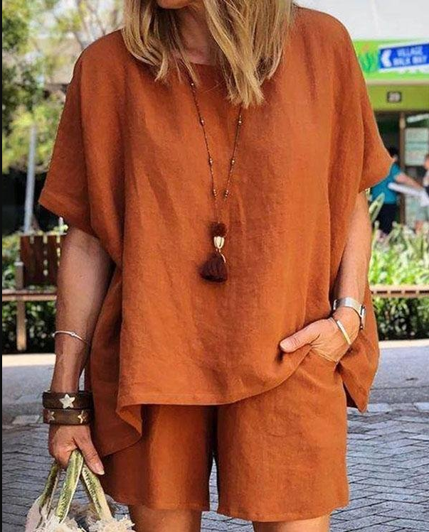 Casual Loose Pure Color Crew Neck Blouse Shorts Two-piece Set