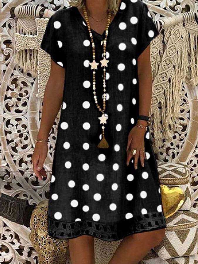 Women's Fashion Casual Polka Dot Print V-Neck Short Sleeve Mid-Length Dress