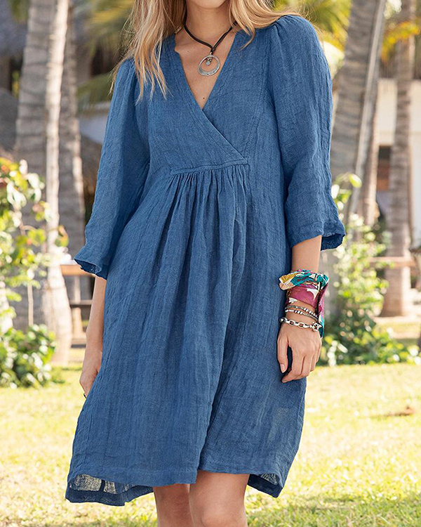 Linen Cotton V Neck Pleated Lantern Sleeve Mini Dress Casual Dress