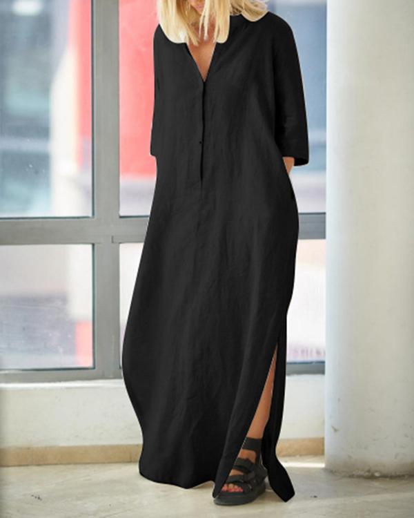 Casual Linen Cotton Plain Color Long Sleeve Midi Dress