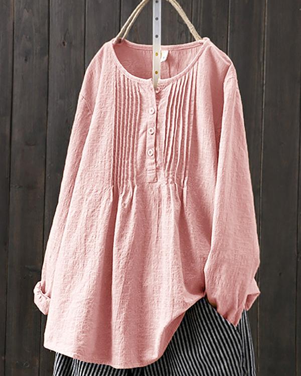 Elegant Button Pure Color Round neck Linen Pleated Dress