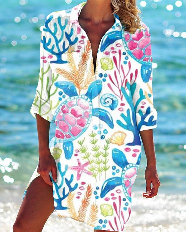 Linen Cotton Loose Button Down Shirt Dress Beach Cover Ups
