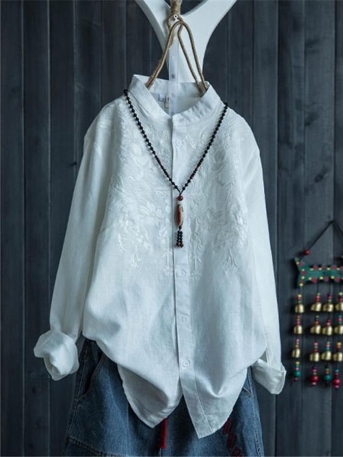 Women's Embroidered Standing Collar Literary Vintage Cotton Shirt