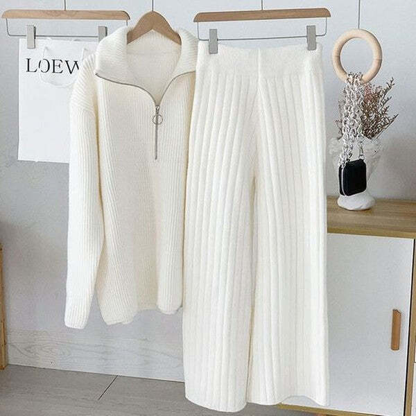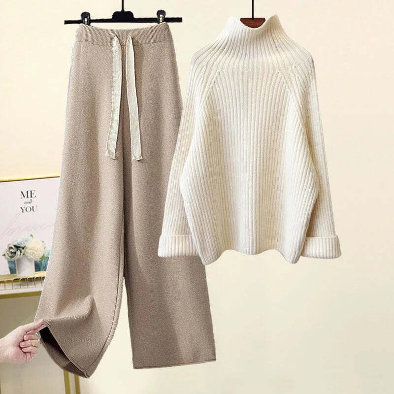 Cross -border European Standing Wide -leg Pants Knit Cardigan Jacket Two -piece Female Autumn Loose And Fantasy Fashion European Cargo Suit Tide