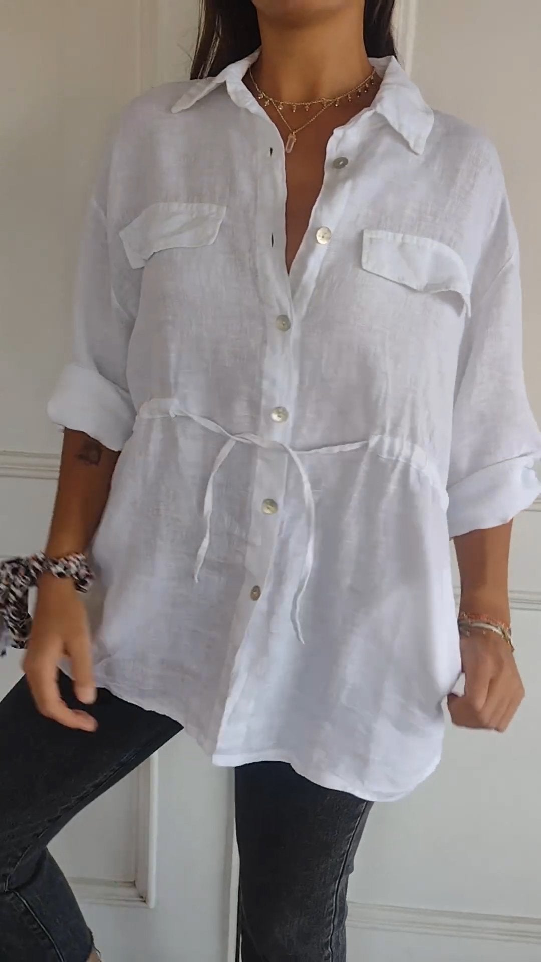 Cotton and Linen Shirt with Pocket Drawstring Design