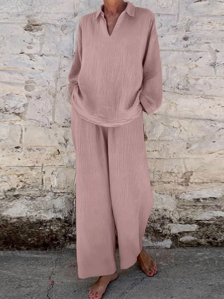 Casual Loose Solid Color V-neck Linen Long-sleeved Jumpsuit