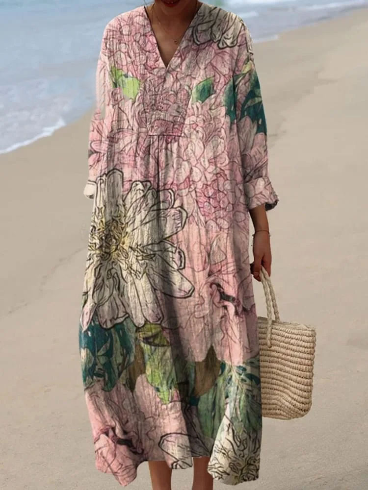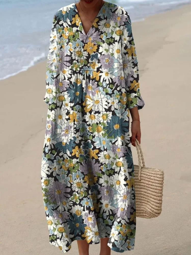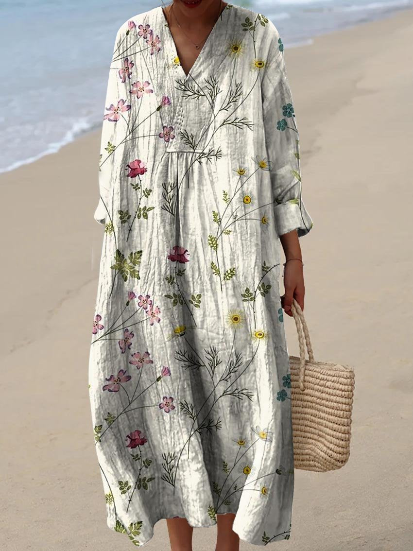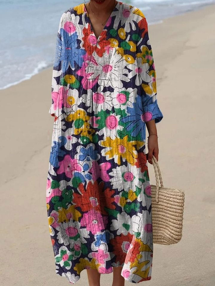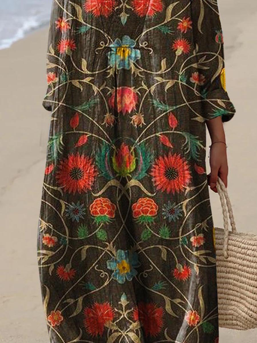Retro Boho Floral Art Printed V-Neck Elegant Chic Loose Short Sleeve Midi Dress