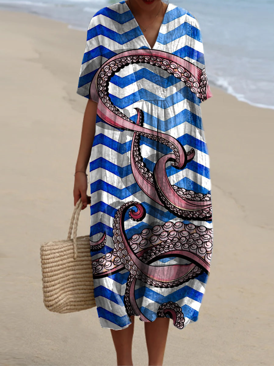 Vintage Octopus Art Print V Neck Elegant Chic Loose Short Sleeve Midi Dress