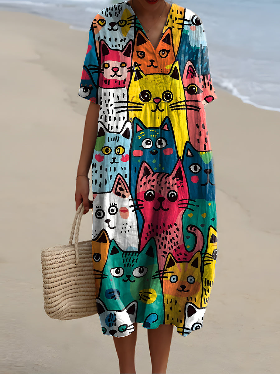 Vintage Cat Print V-Neck Elegant Chic Loose Short Sleeve Midi Dress