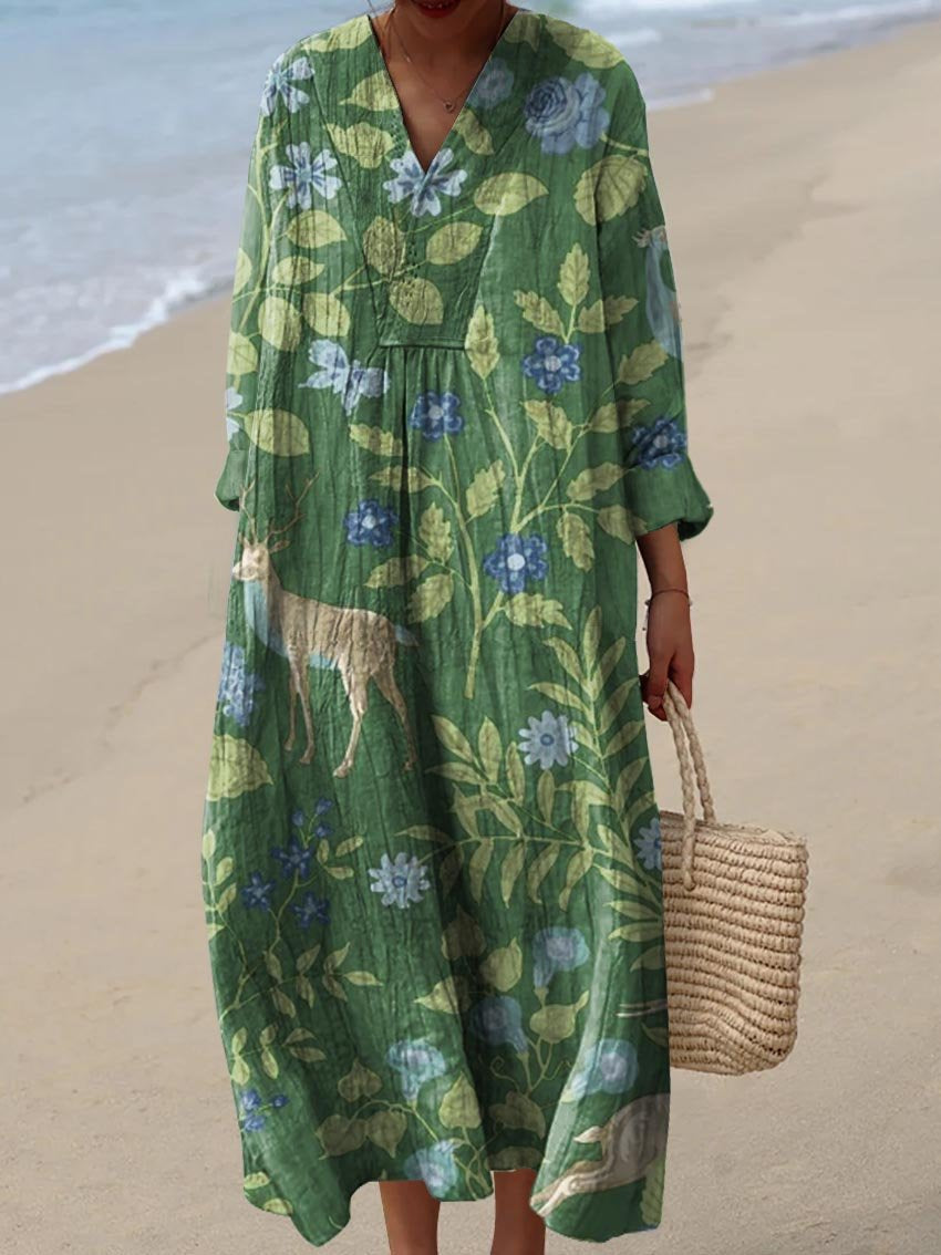 Women's Vintage Lovely Floral Animals Art Print Flowy Dress