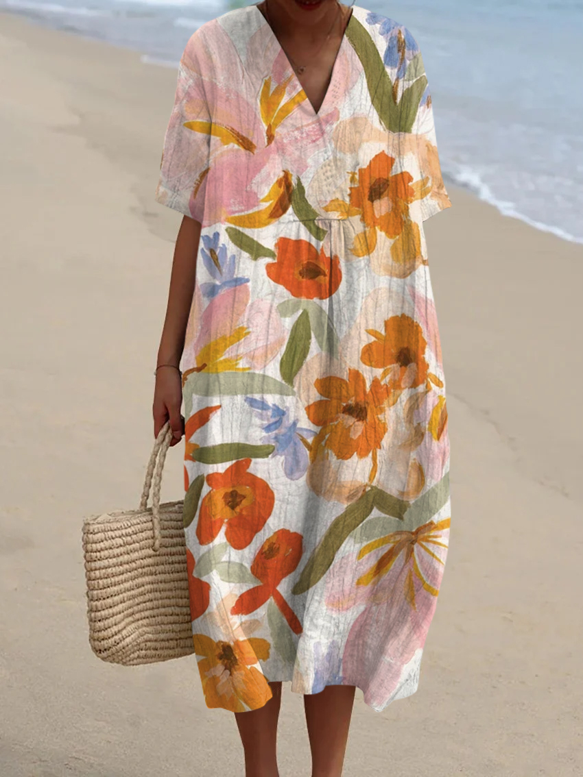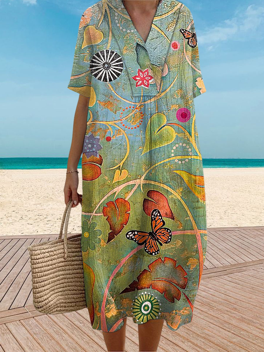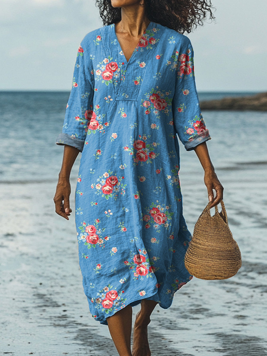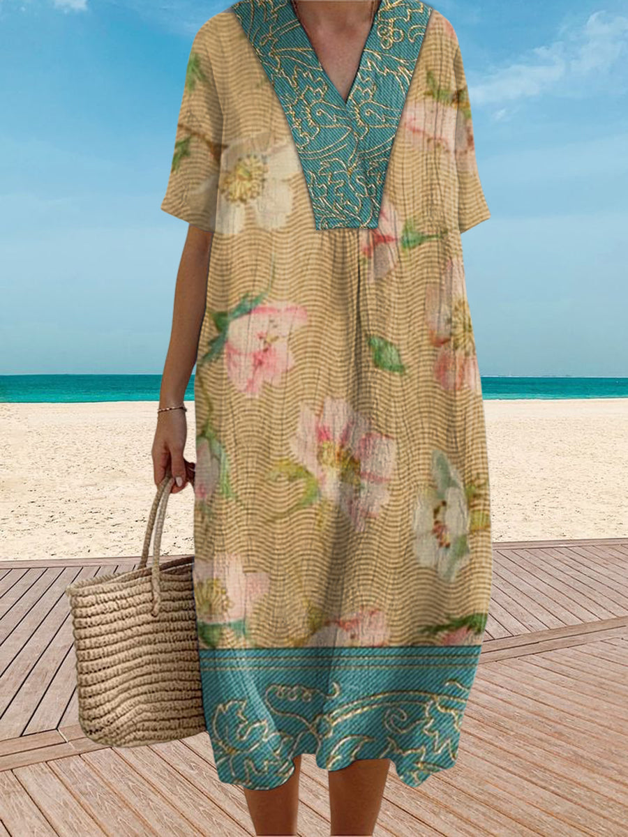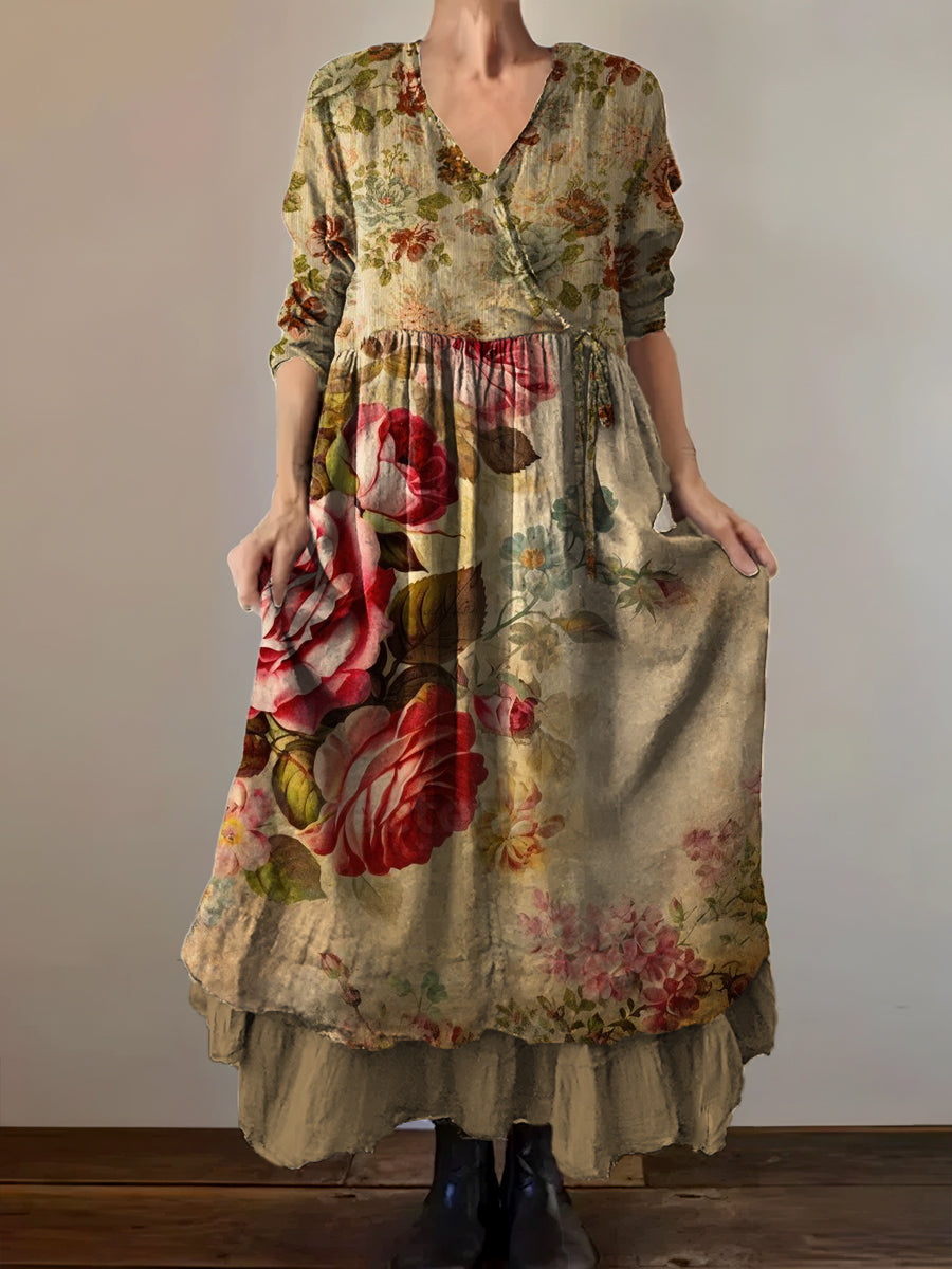 Vintage V-Neck Floral Art Print Elegant And Chic Loose Midi Dress