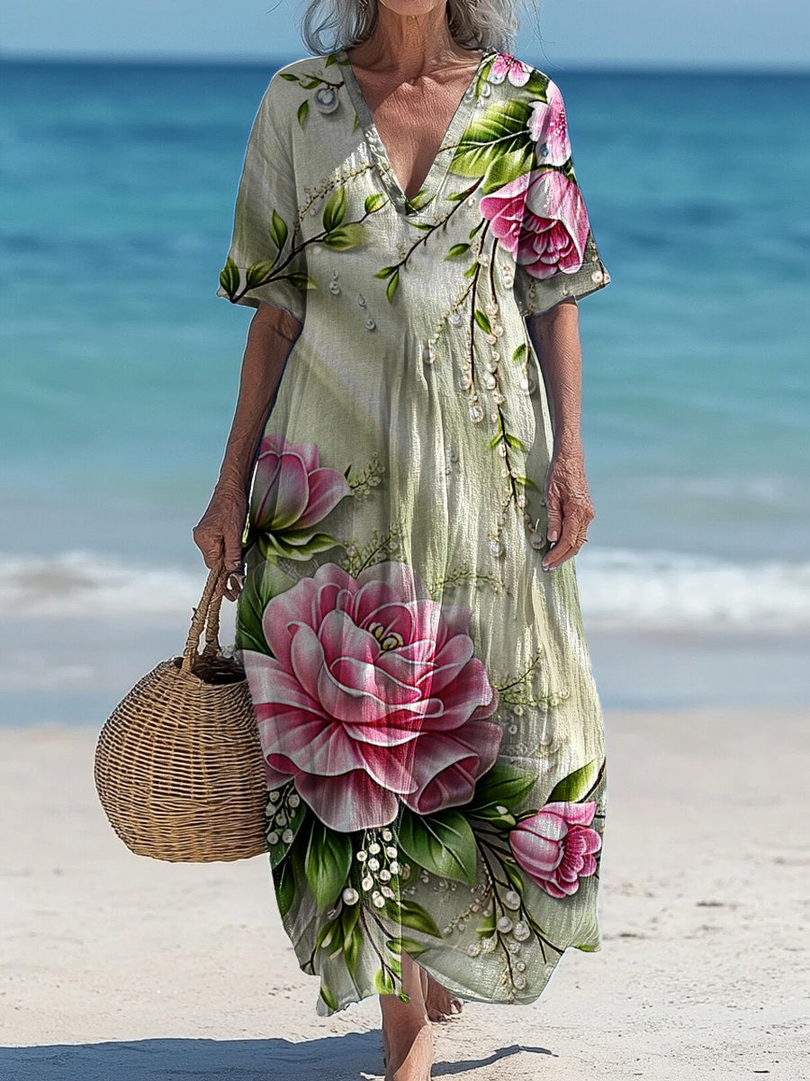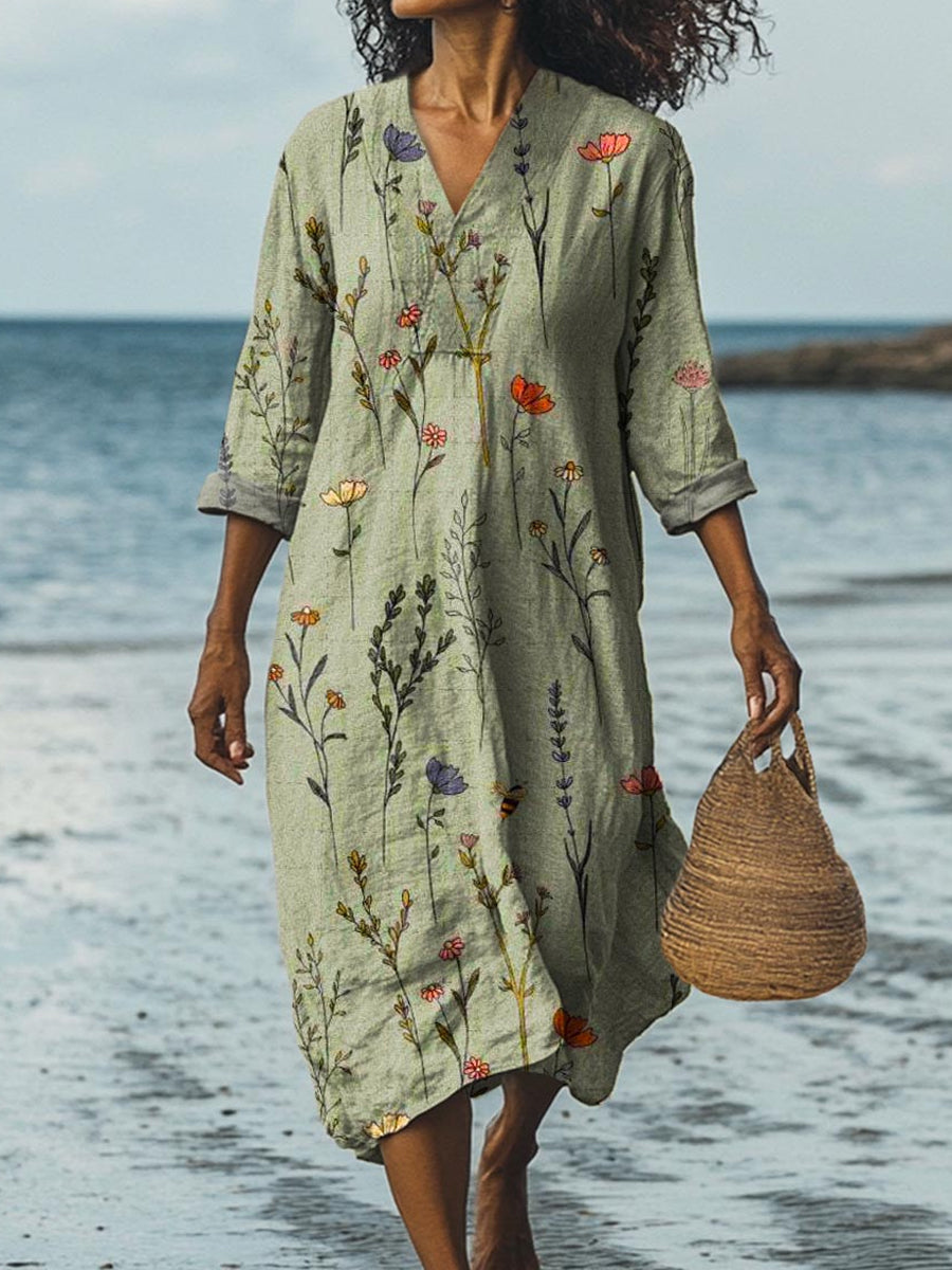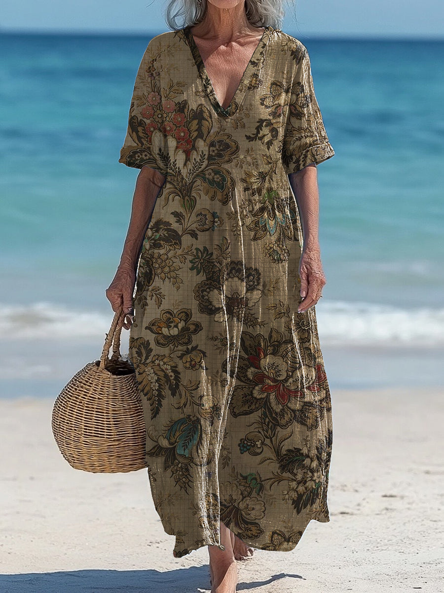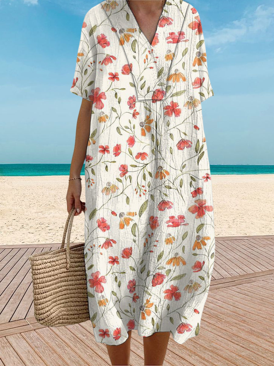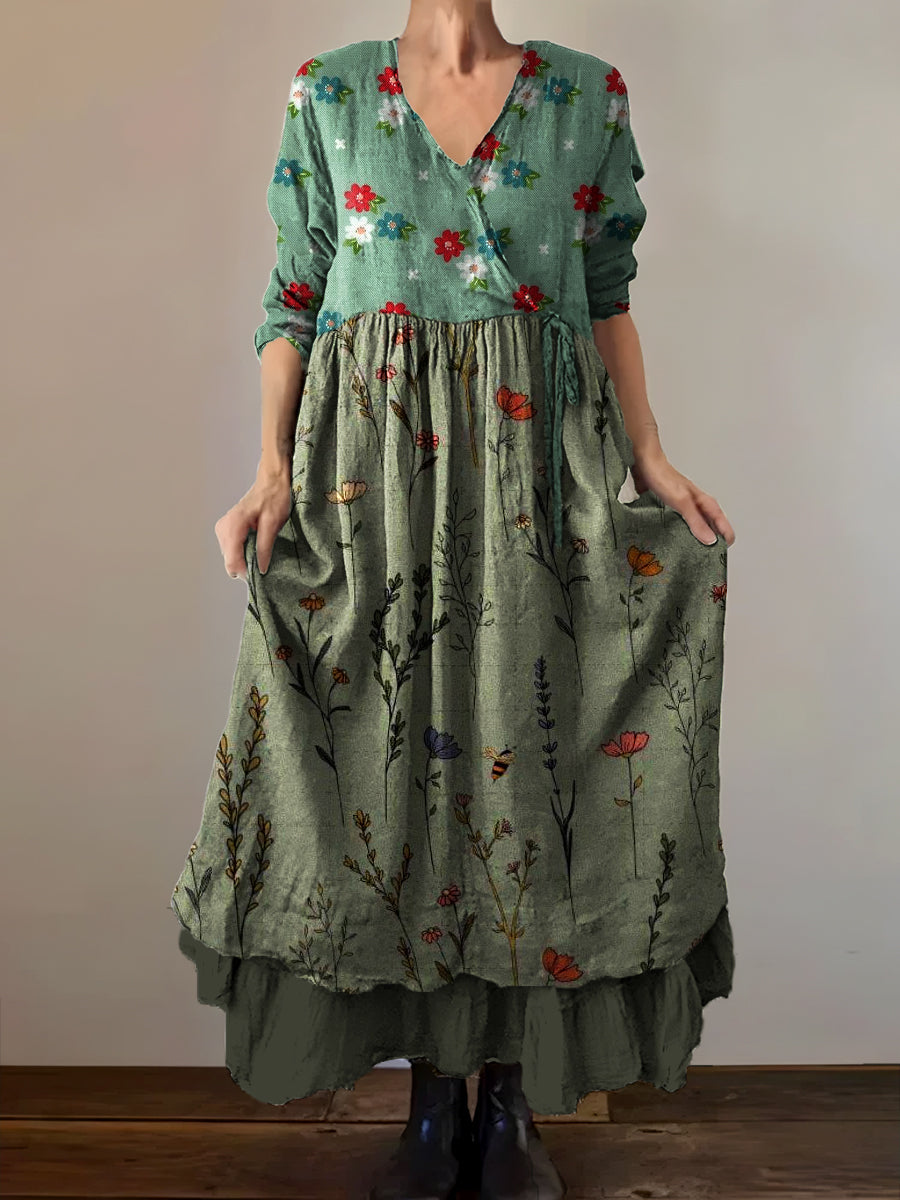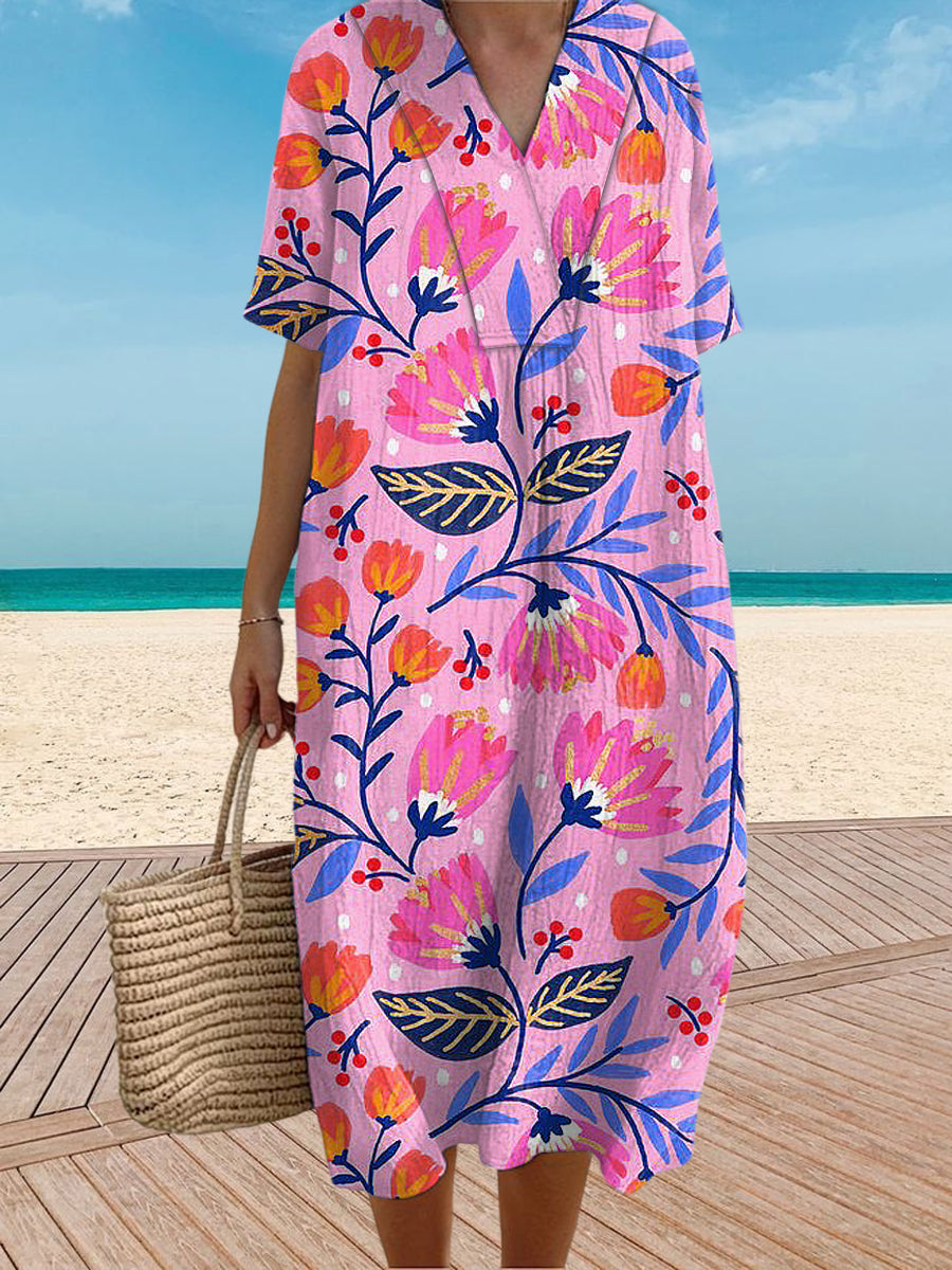 Vintage V-Neck Floral Art Print Elegant And Chic Loose Midi Dress