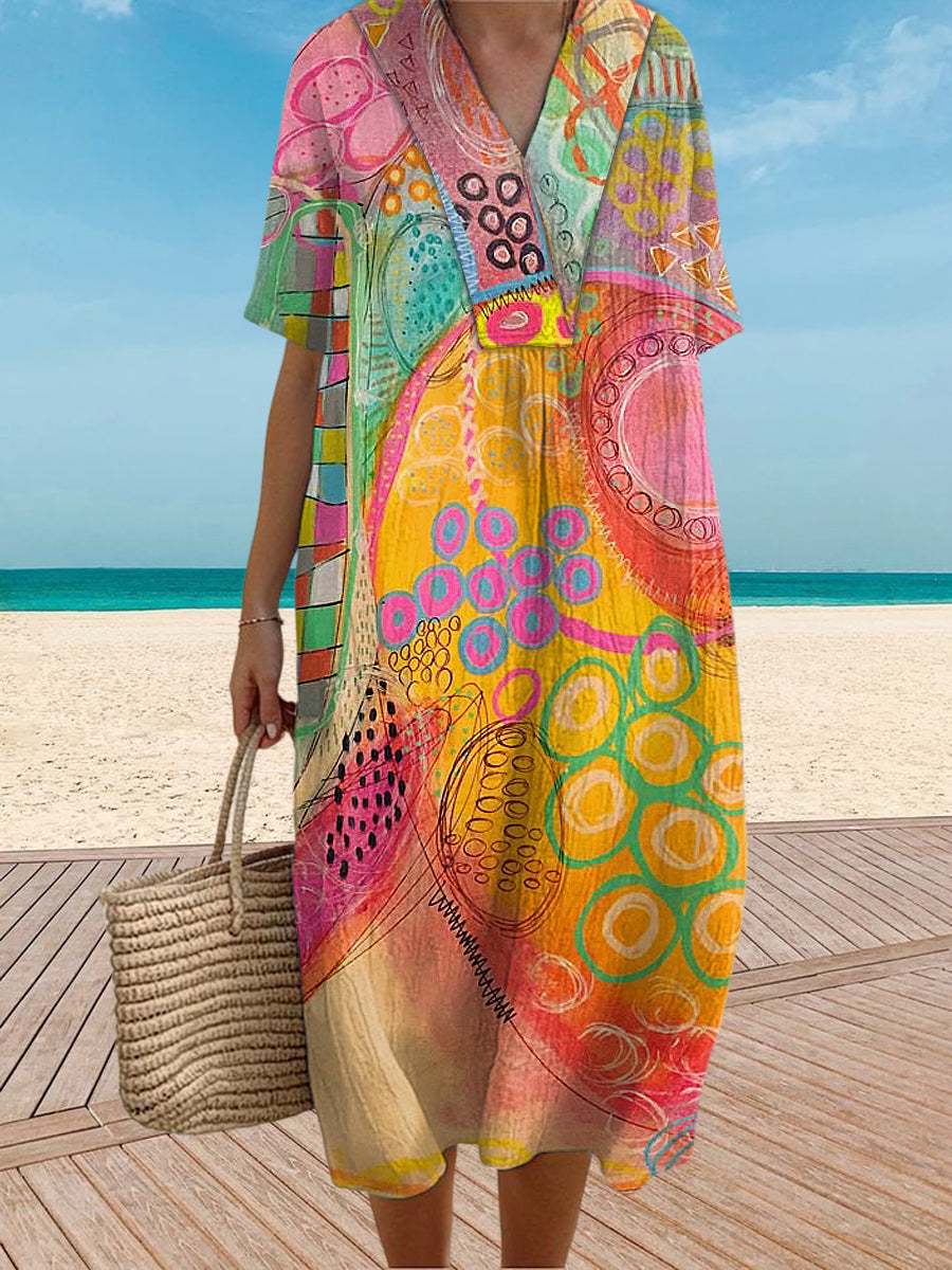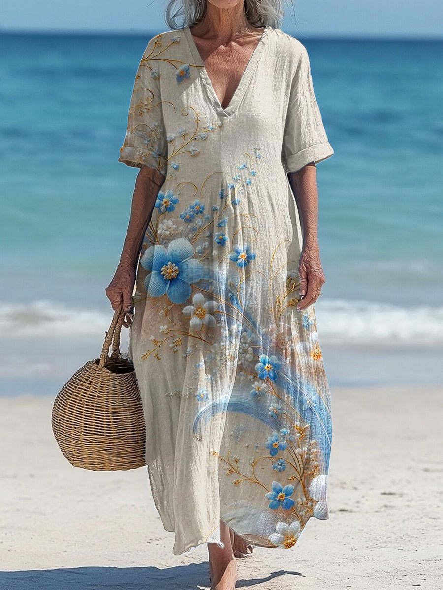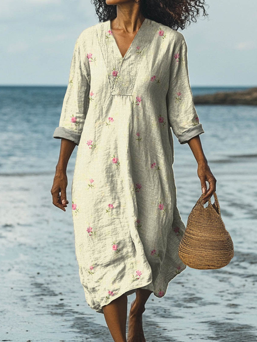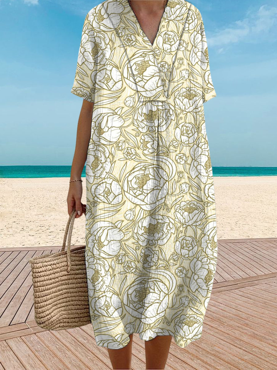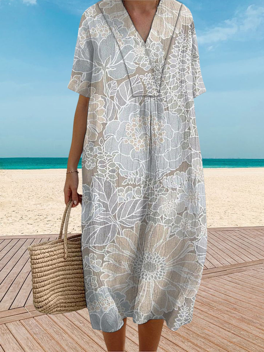 Vintage V-Neck Floral Art Print Elegant And Chic Loose Midi Dress