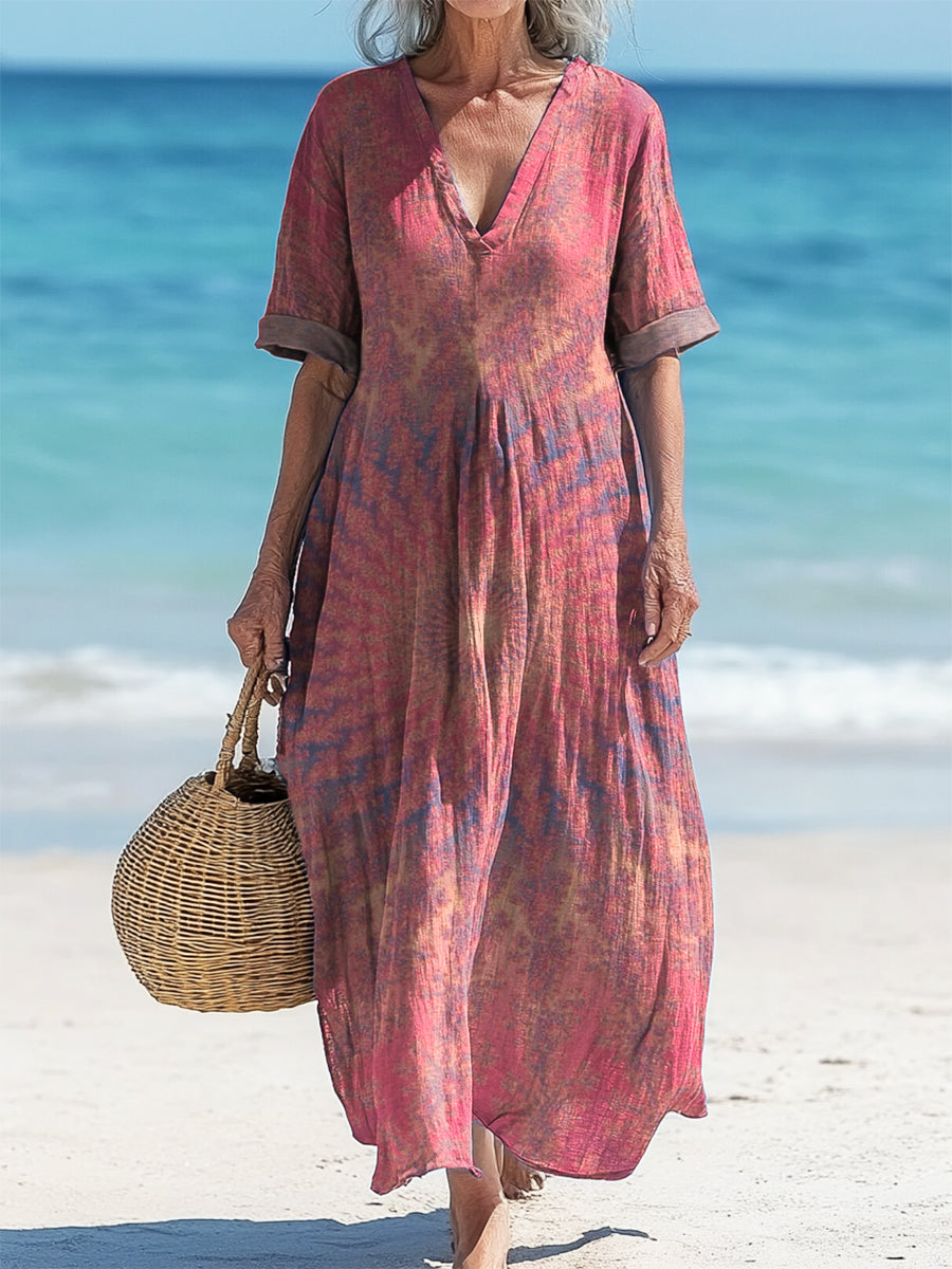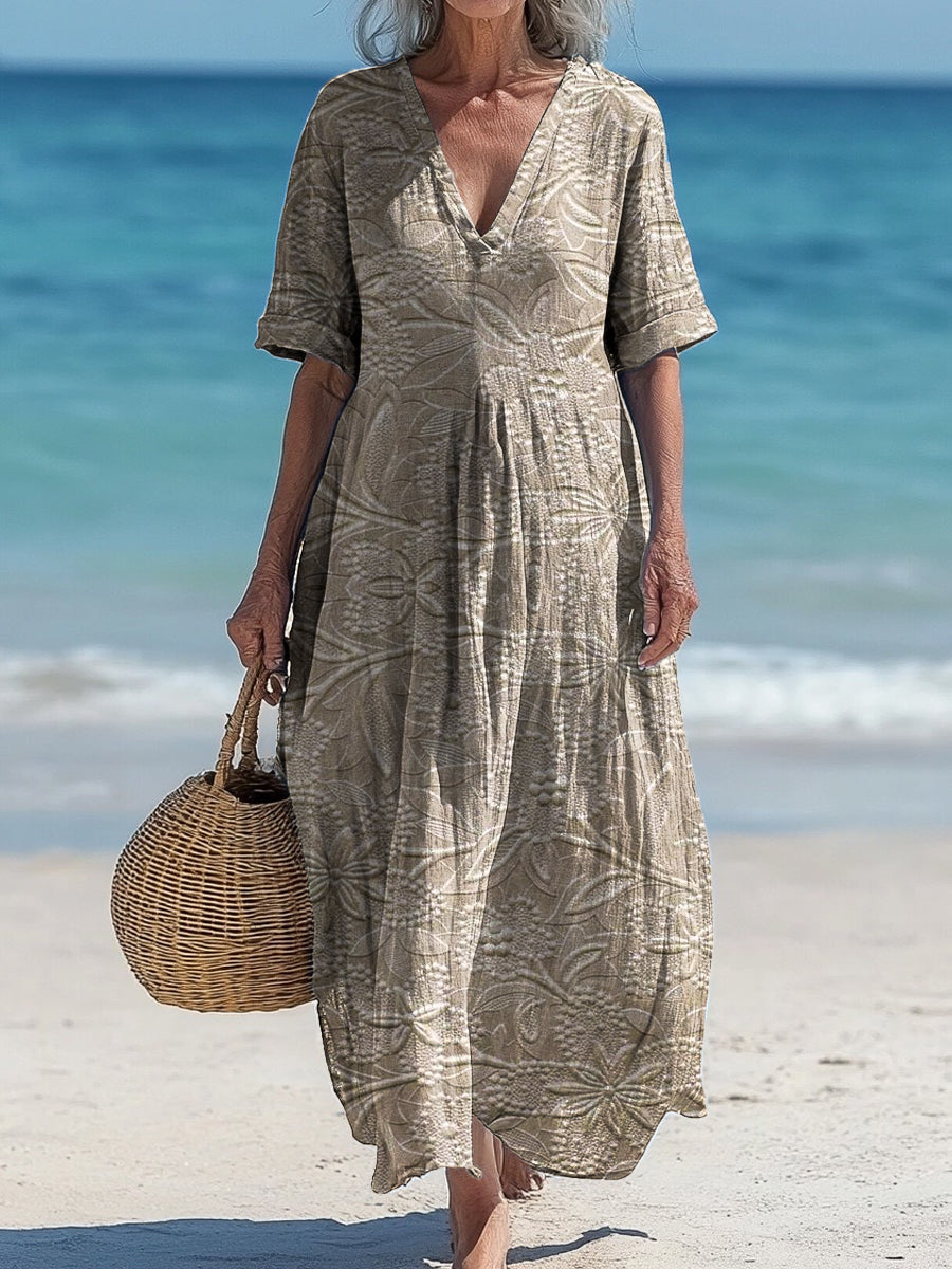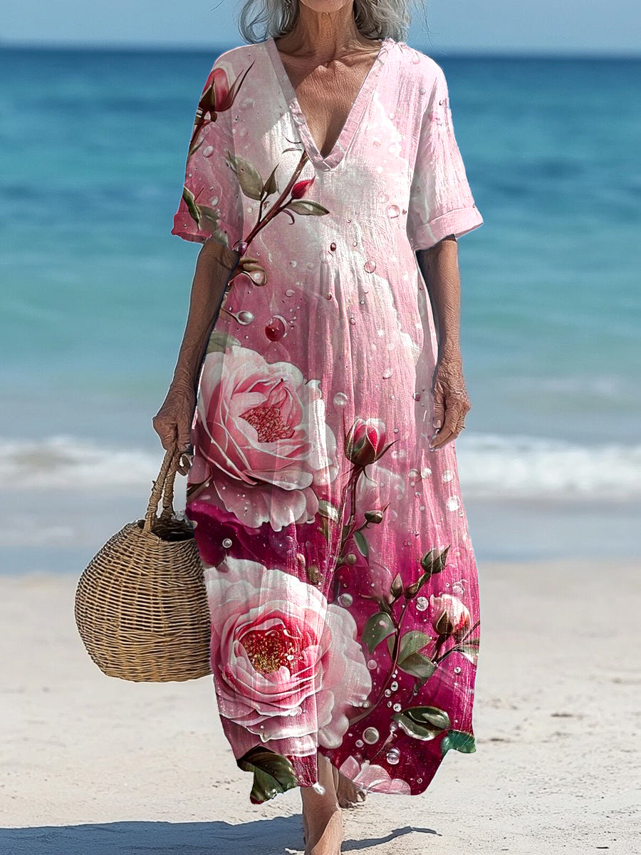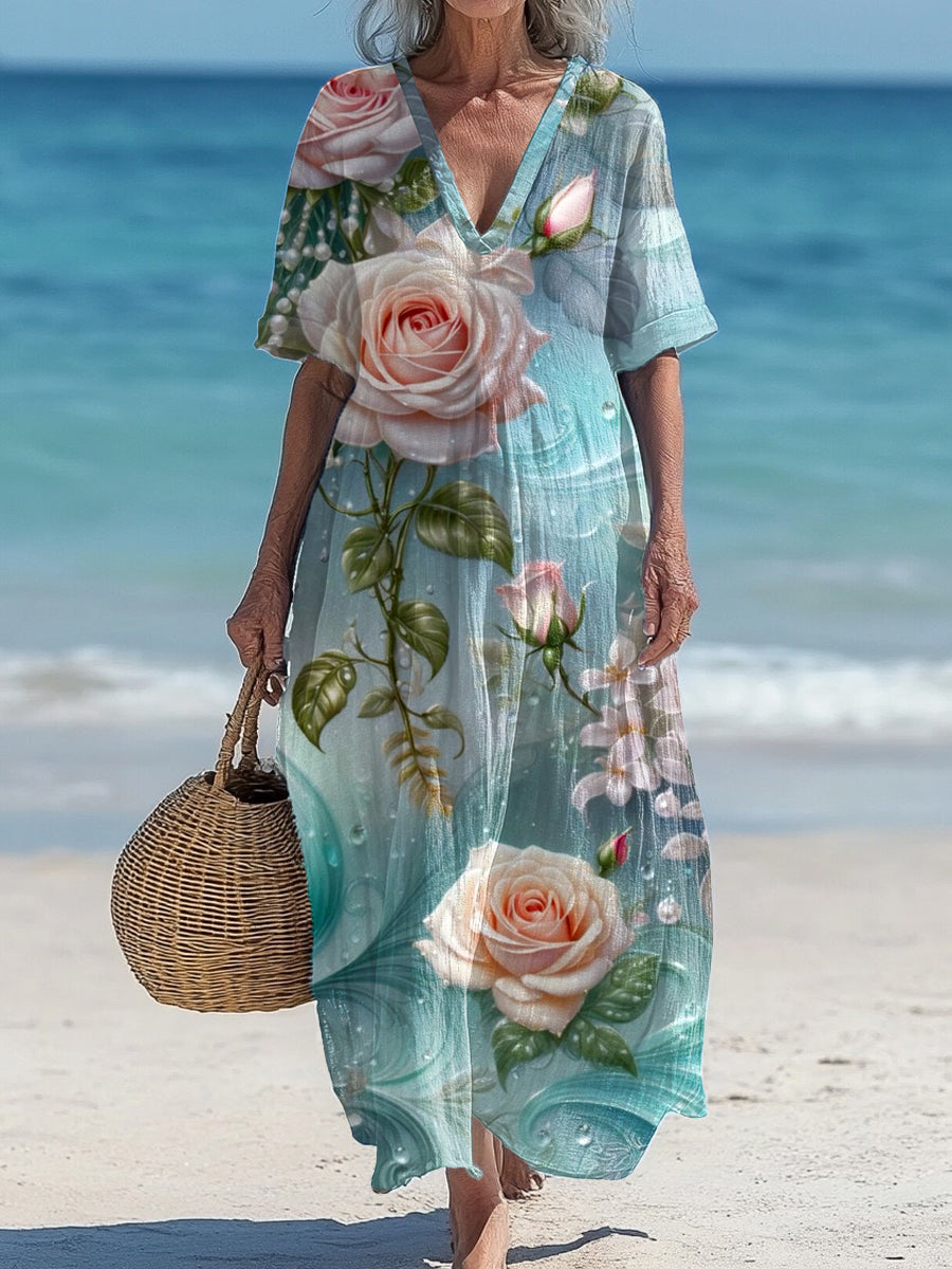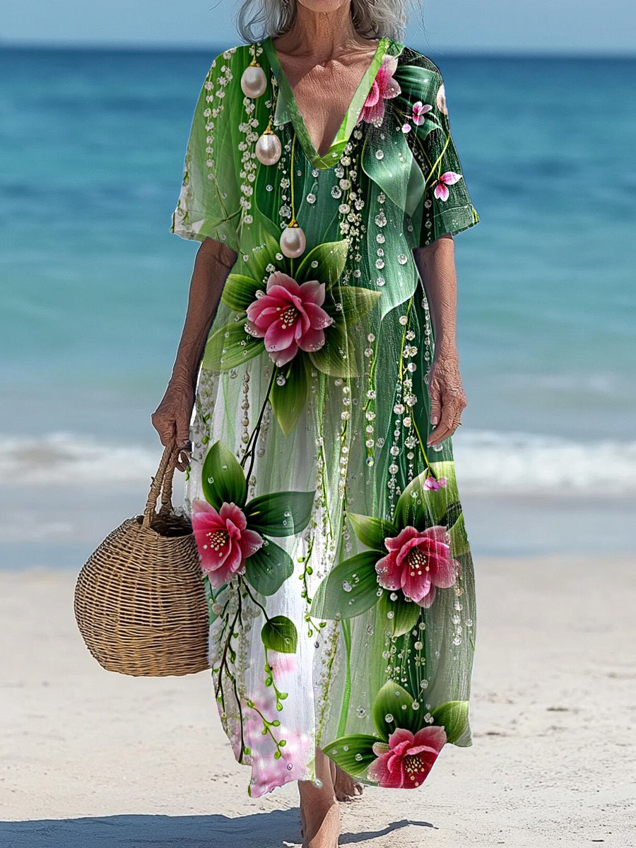 Vintage V-Neck Floral Art Print Elegant And Chic Loose Midi Dress