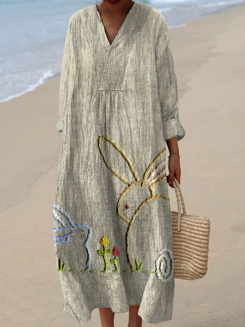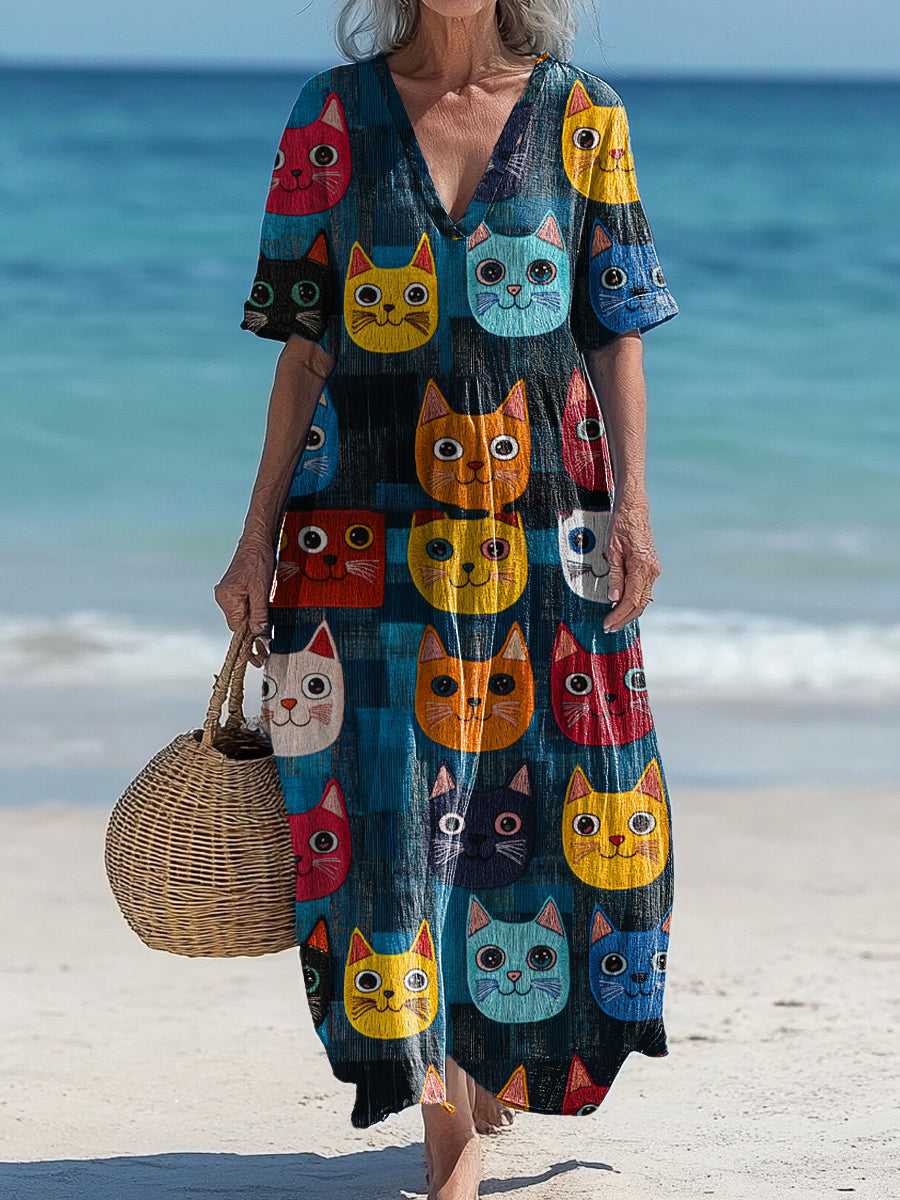 Vintage V-Neck Cat Art Print Elegant And Chic Loose Midi Dress