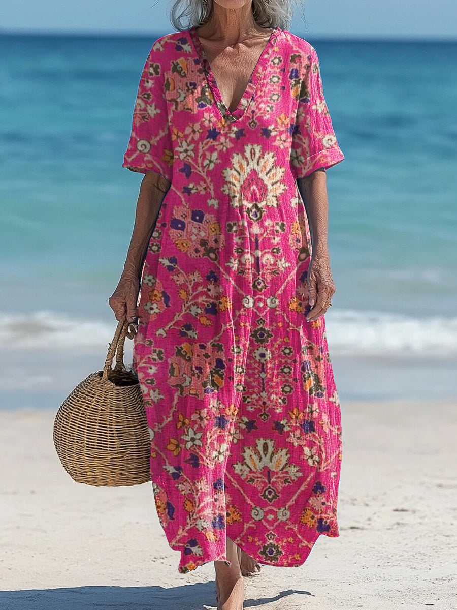 Vintage V-Neck Bohemian Floral Print Elegant Chic Loose Midi Dress