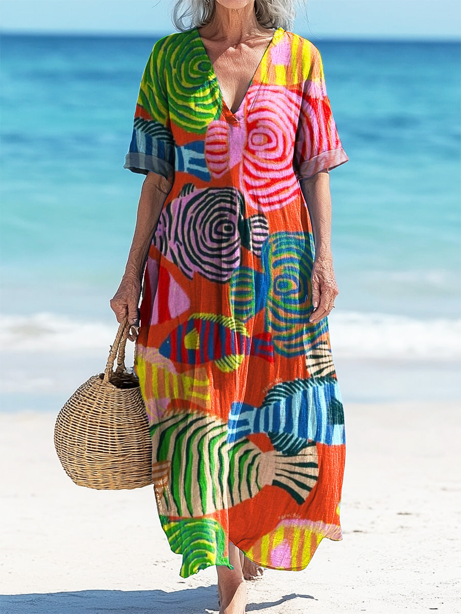 Vintage V-Neck Fish Art Print Elegant And Chic Loose Midi Dress
