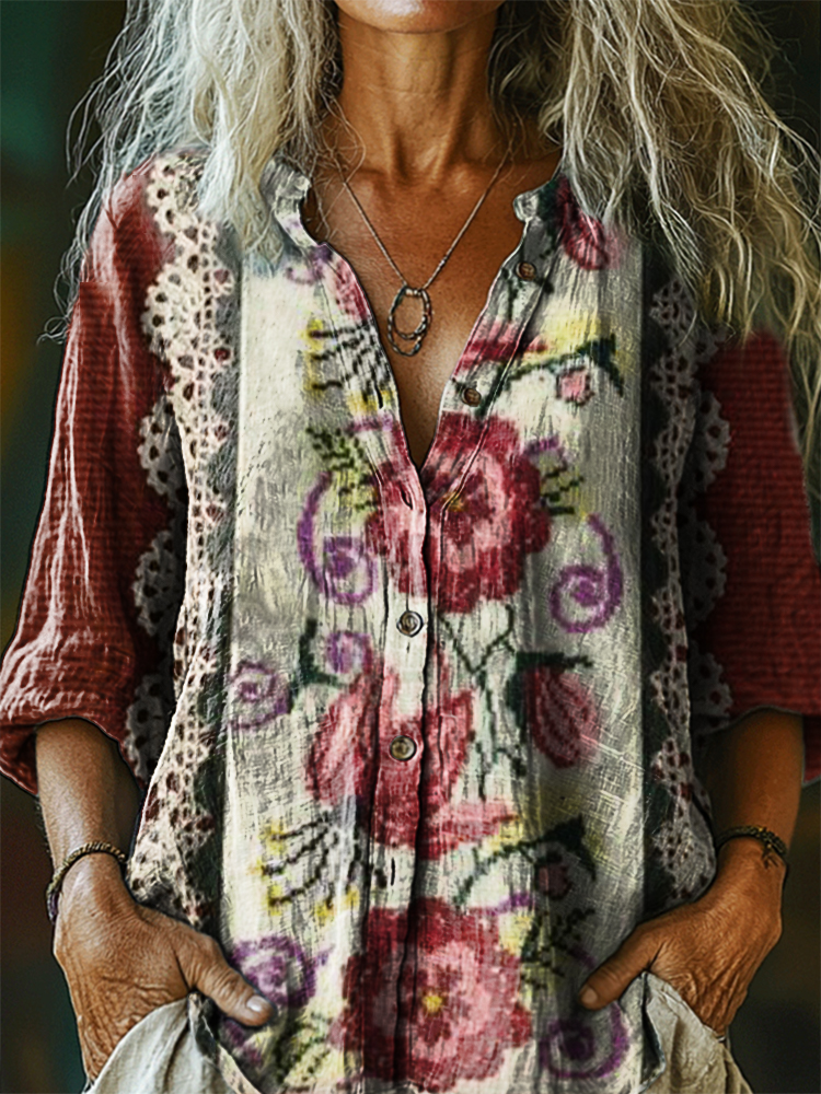 Women's Vintage Floral Patchwork Art Print Casual Cotton Linen Shirt